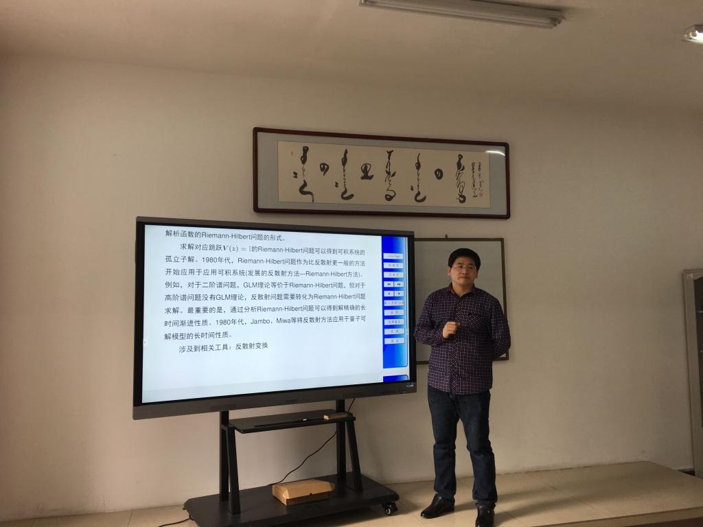 张盛教授结合自己近几年的研究工作,从非线性演化方程的可积性及孤子解、非线性可积系统的通有性、稳定性、守恒律与孤子解、非线性可积系统的生成及其精确解的一些解析方法、AKNS谱问题正散射问题、反散射问题及其推广、广义等谱AKNS族的推导、反散射变换与孤子解、广义非等谱AKNS方程的推导、反散射变换与孤子解、广义BK方程的第三类Darboux变换与孤子解、相关热点问题与公开问题、近年来的研究工作及代表性成果等十个方面系统介绍非线性可积系统的解析方法。报告内容丰富,资料翔实,充分体现了张教授的渊博学识和严谨治学的学术研究态度,参会师生受益匪浅。