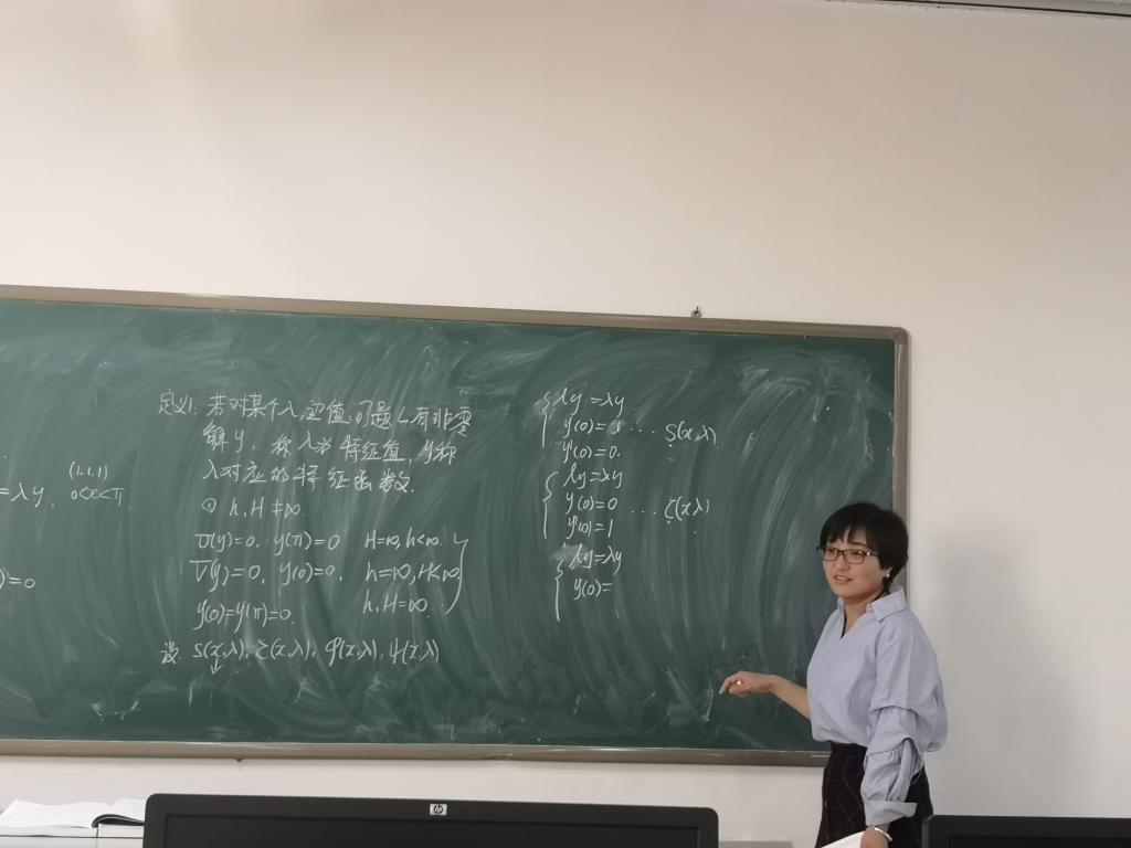 为完善研究反谱问题的基础, 2018年10月25日在第三次讨论课上团队组员轮流报告关于反谱问题的书--《Inverse Sturm-Liouville Problem and Their Applications》。首先,金国海博士讲解了常数变易法求解非齐次常微分方程及朗斯基行列式性质,为报告该书的内容做了铺垫。随后,青梅博士介绍 Sturm-Liouville 问题的谱的渐近式。剩余半小时内团队组员讨论了吴晓红老师的近期研究内容,并提出建议。这正好充分体现了开展讨论班的初衷--快速发现问题、解决问题并呈现成果。