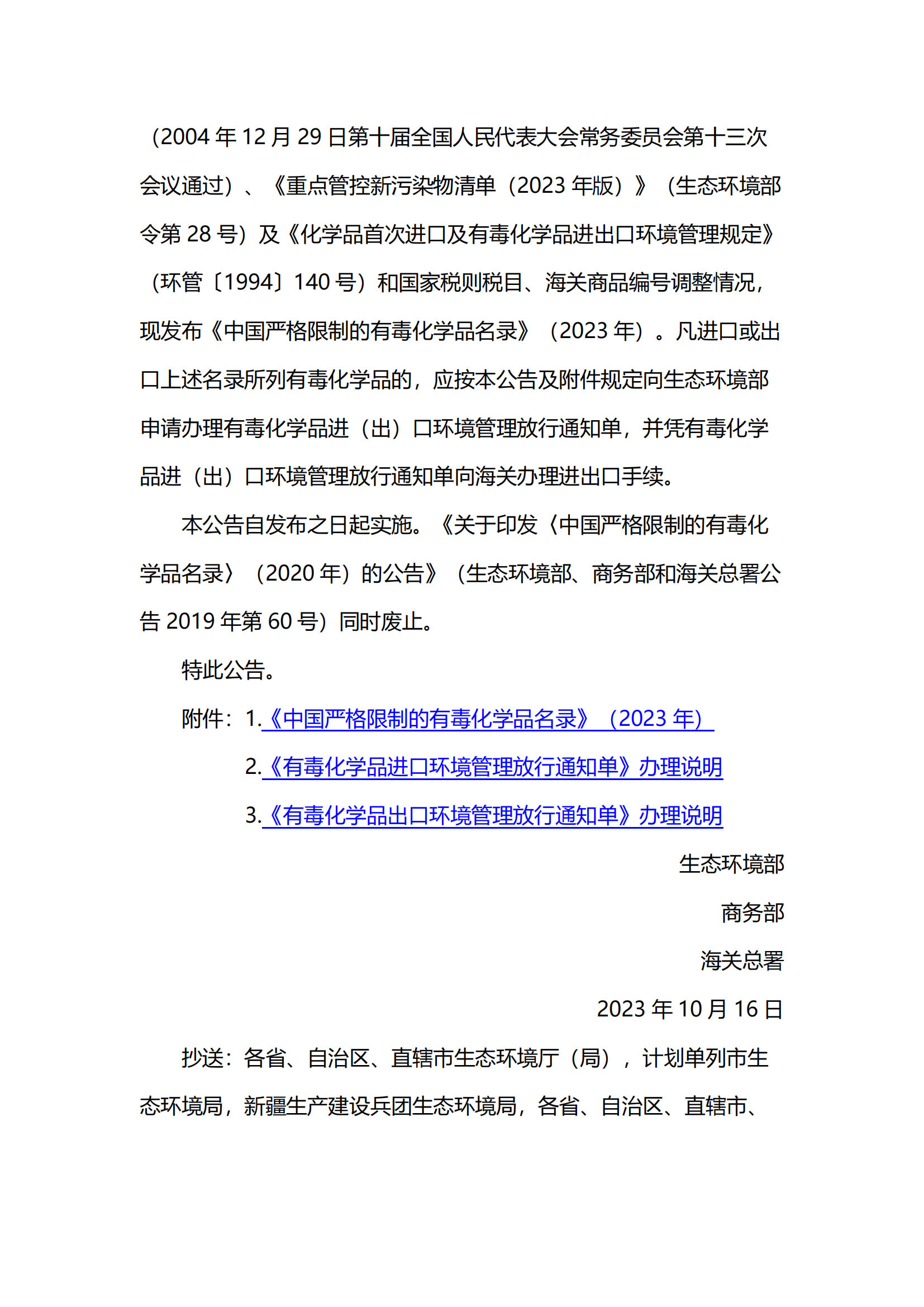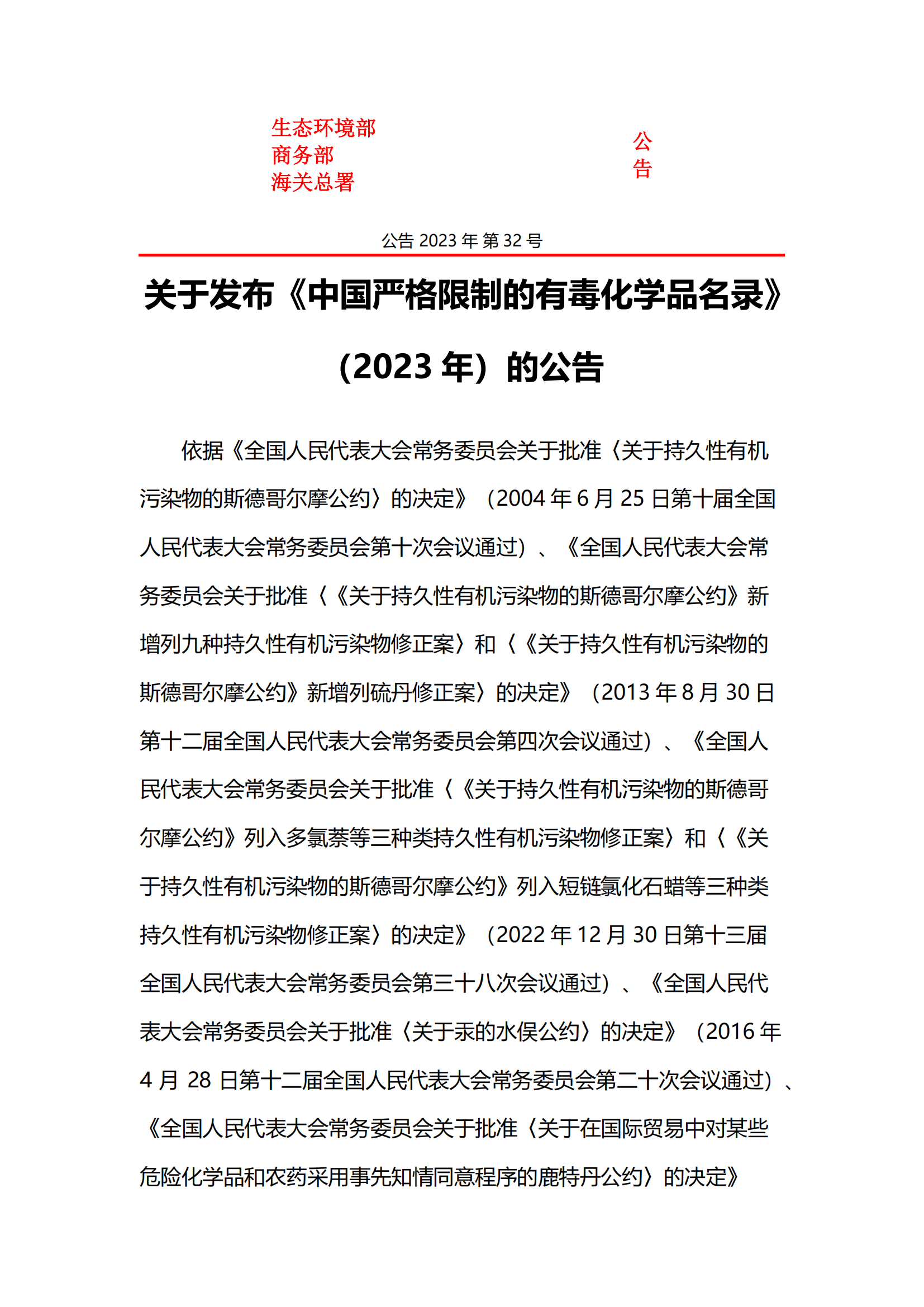 关于发布《中国严格限制的有毒化学品名录》 (2023 年)的公告