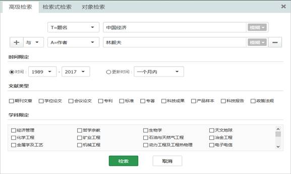 如需查看标题包含中国经济,作者为林毅夫的文献,则可以在高级检索-向导式检索页面做以下设置: