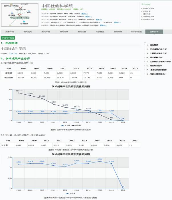 范例:如需查看中国社会科学院的学术计量报告,您可以在平台首页进行对象检索,进入该对象细览页后点击分析报告按钮,即可查看相应内容。