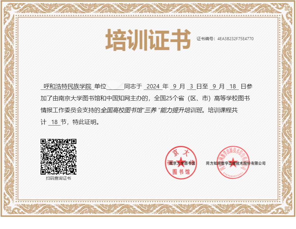 9月3日至18日,南京大学图书馆与中国知网联合举办“全国高校图书馆‘三养’能力提升班”,图书馆组织馆员线上参加培训。此次培训的主题为“聚焦核心素养提升 赋能创新人才培养”,围绕“信息赋能 知行致远”、“学术引航 研途同行”以及“文化润心 向美而行”三大核心主题,邀请该领域内顶尖专家学者进行深度解读与在线授课,进一步提升馆员的“信息素养”“学术素养”“文化素养”等专业素养和服务能力,强化高校图书馆服务育人的职能作用。我馆共32名馆员报名参加培训,经过两周的学习,23名馆员完成全部课程、通过考试、获得培训证书。