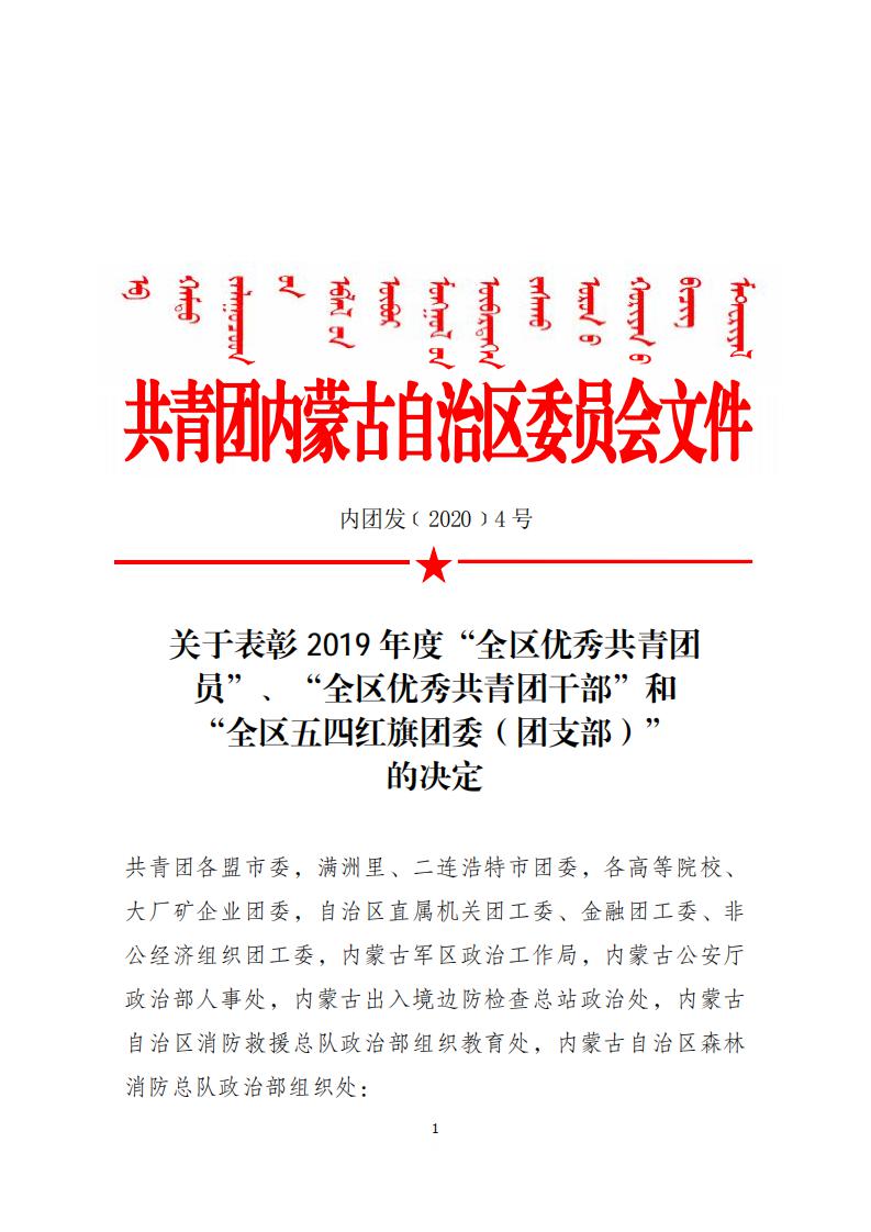 近日,共青团内蒙古自治区委员会下发了“关于表彰2019年度“全区优秀共青团员”、“全区优秀共青团干部”和“全区五四红旗团委(团支部)”的决定(内团发[2020]4号),Beat365团委荣获“全区五四红旗团委”荣誉称号。