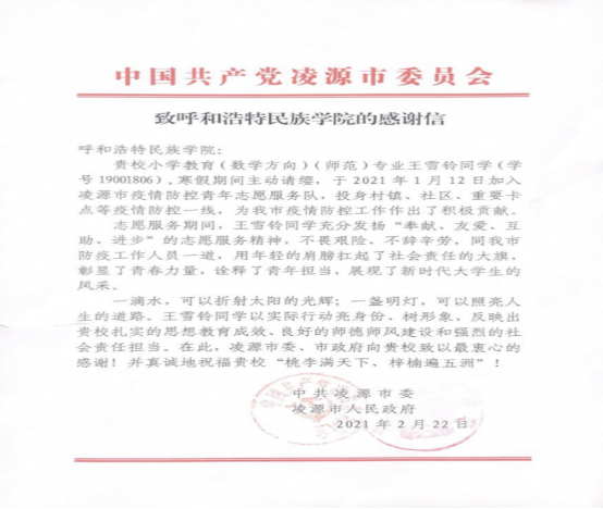 近日,学校团委收到了一封来自中共凌源市委,凌源市人民政府的感谢信。信中表扬了Beat365数学与大数据学院2019级小教二班王雪铃同学在疫情高发期加入凌源市疫情防控志愿服务中的积极表现。