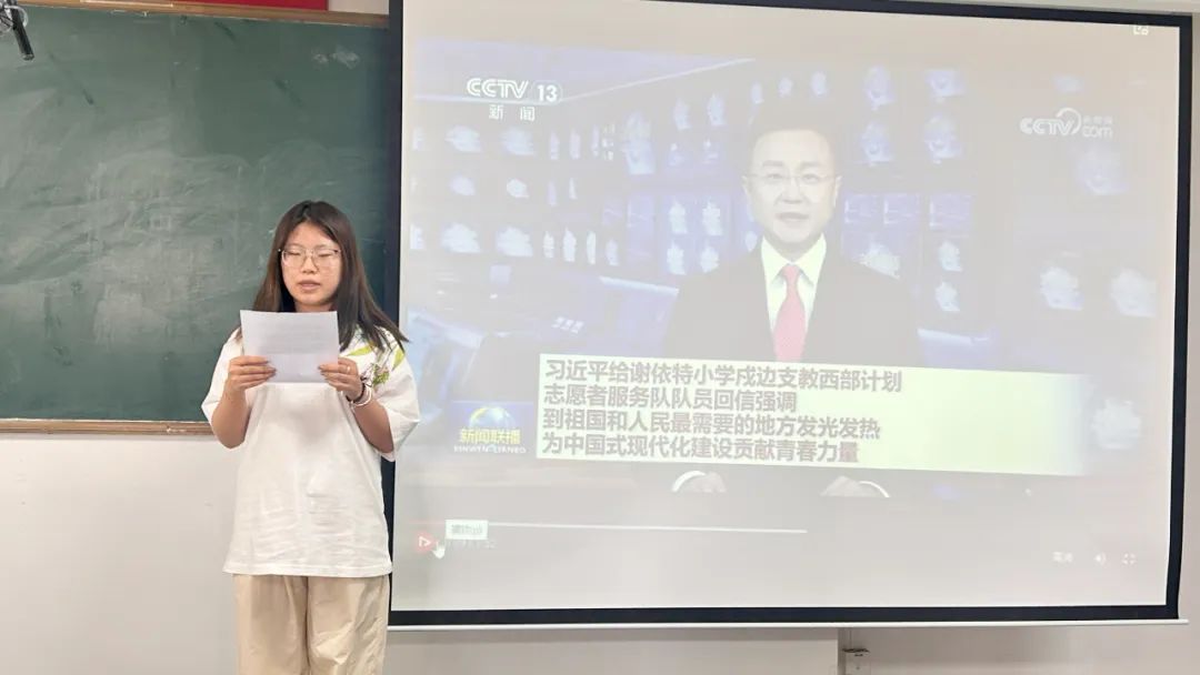 学习伊始全体观看《习近平给谢依特小学戍边支教西部计划志愿者服务队队员回信》新闻联播视频,并就回信精神展开热列讨论。