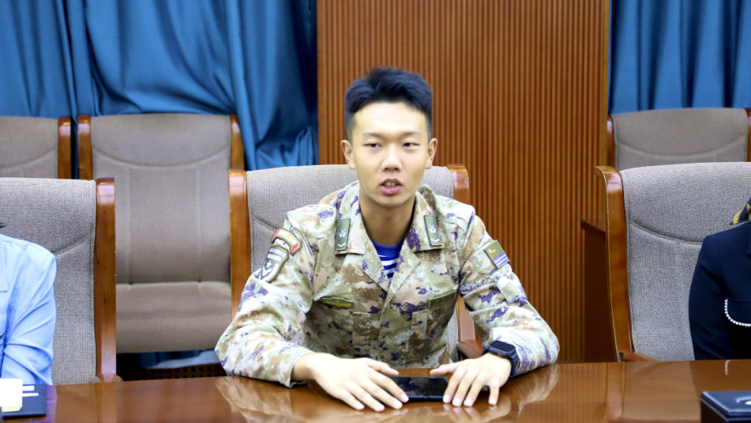 座谈会上,来自商学院2024级市场营销专升本班的退役士兵董皓天分享了作为预备役部队方队一员参与纪念抗战胜利暨世界反法西斯战争胜利80周年阅兵的难忘经历。他用生动的语言,描绘了阅兵训练场的艰辛与荣耀,从站军姿的纹丝不动,到踢正步的精准到位,再到练眼神的目光如炬,每一个细节都尽显新时代大学生军人的飒爽英姿。之后,董皓天与在场师生进行了互动并耐心解答了关于阅兵细节、作息安排、训练内容、使命职责等方面的疑问,现场气氛热烈而融洽。期间,学生干部也分享了自身观看阅兵的真切感想。