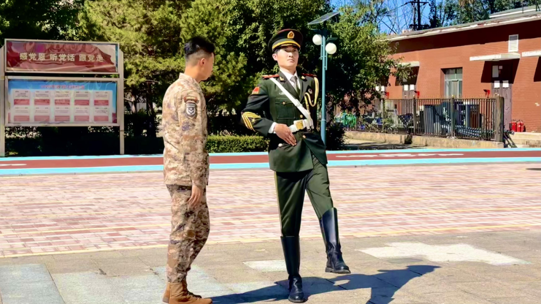 座谈会后,董皓天为学校国旗护卫队队员进行专业指导,示范站姿、正步走等动作要领,彰显军人素养。
