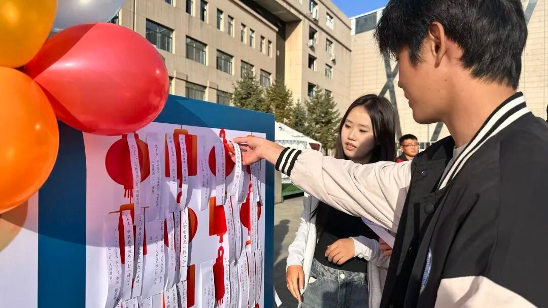 活动伊始,同学们有序抵达天骄广场,活动现场秩序井然,大家精神饱满,满是期待。随后“中秋灯谜会”启动,谜题涵盖中秋诗词、习俗与典故,同学们三五成群讨论,沉浸在智慧与趣味的猜谜中,猜中者可兑换中秋月饼、学习用品、小零食等奖品,兑换处排起长队,现场节日氛围愈发浓厚。