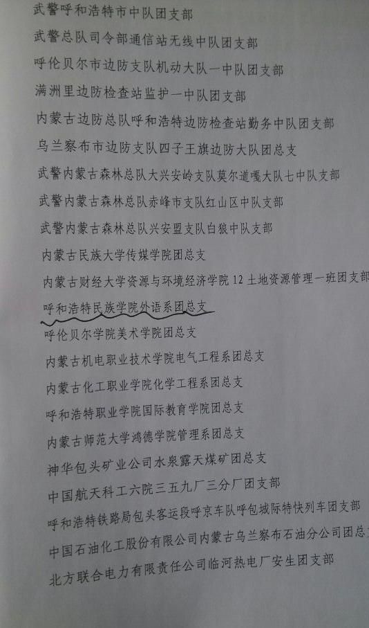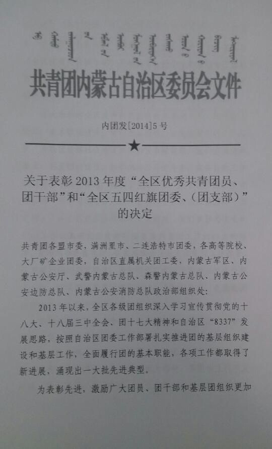在内蒙古自治区团委评选的全区2013年度五四表彰中,我系团总支第二次被评为全区五四红旗团总支荣誉称号。