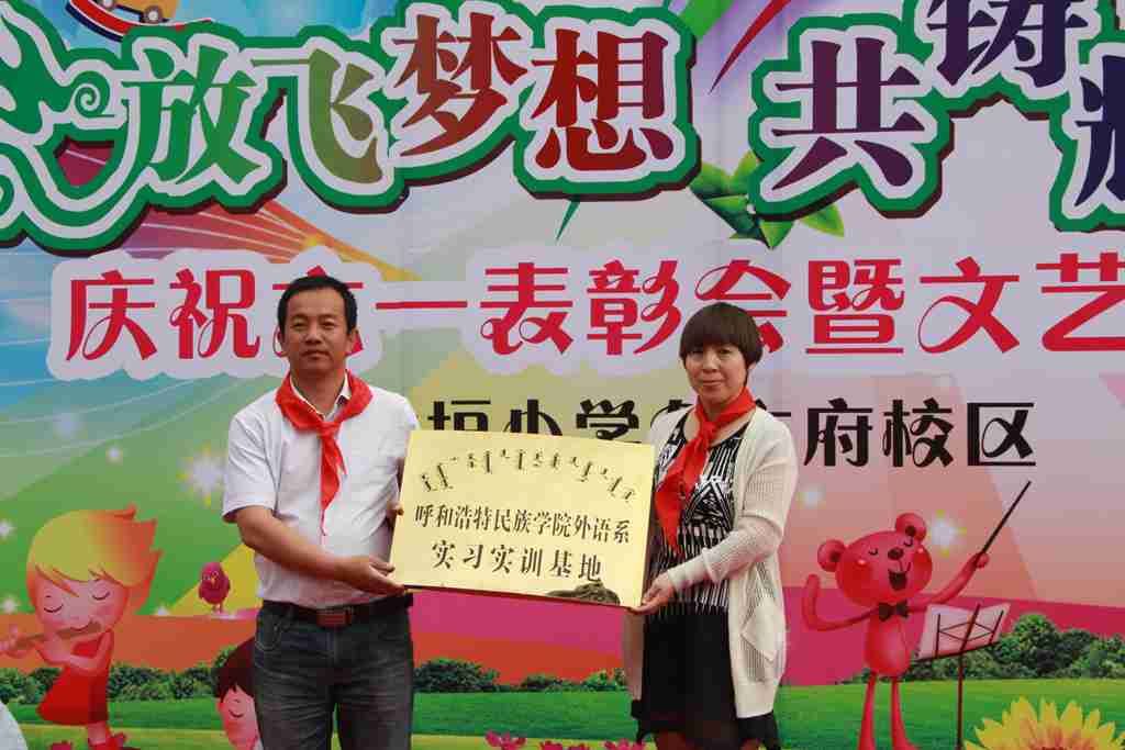 经过外语系与呼和浩特市北垣小学公主府校区(原新城区向阳小学)的多次接洽,双方初步达成了在北垣小学公主府校区建立外语系实践教学基地的意向。2015年5月29日,外语系主任肖查娜、党总支副书记红梅、英语教研室主任红霞一行三人赴北垣小学公主府校区代表学院签订了校外实践教学基地协议,举行了挂牌仪式,并向该校学生赠送了足球、跳绳、毽子等体育用品作为六一儿童节礼物。随后,一行三人兴致勃勃地参加了该校六一儿童节活动,收看了师生精彩的文艺演出。