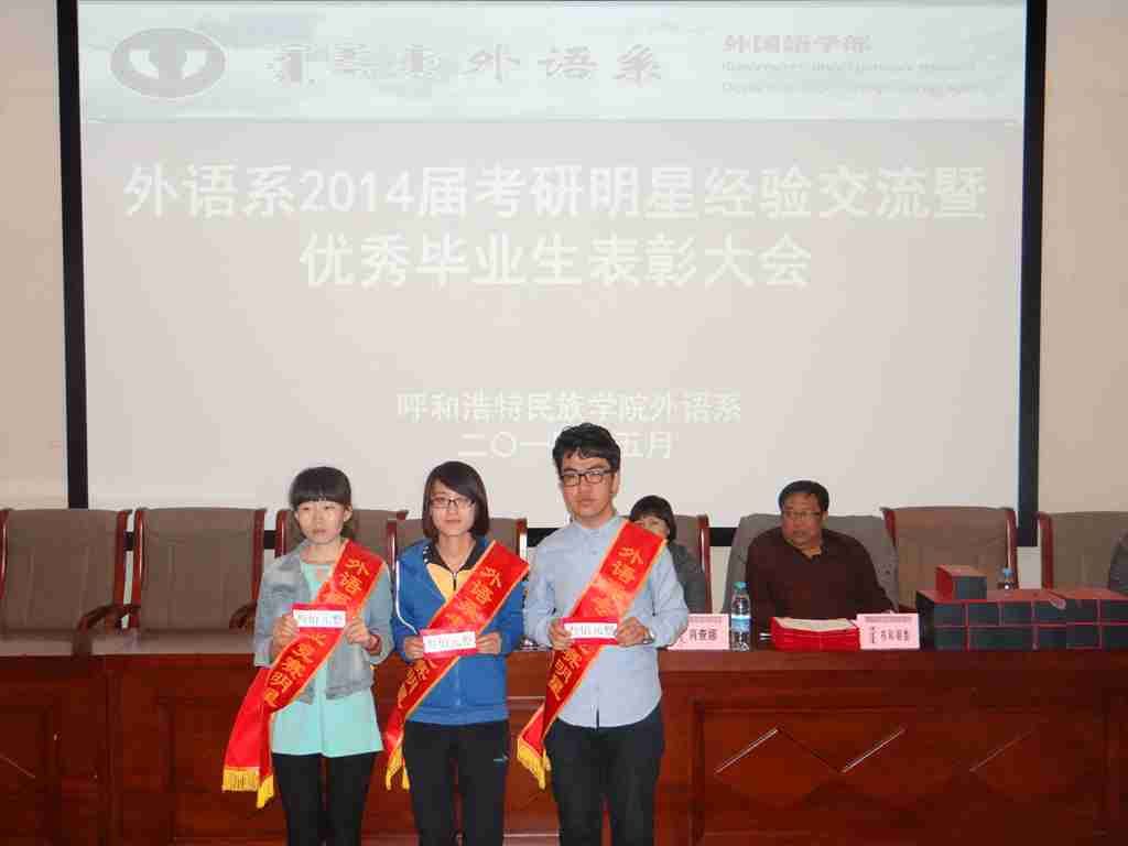 大会首先由肖查娜主任、苏日嘎拉图副主任、布和朝鲁书记分别宣读了《关于表彰2014届考取研究生同学的决定》、《关于表彰在“高教社杯”第十届全国高职高专实用英语口语大赛内蒙古赛区复赛中取得佳绩学生的决定》、《 2014届系优秀毕业生表彰决定》并绶带颁奖。