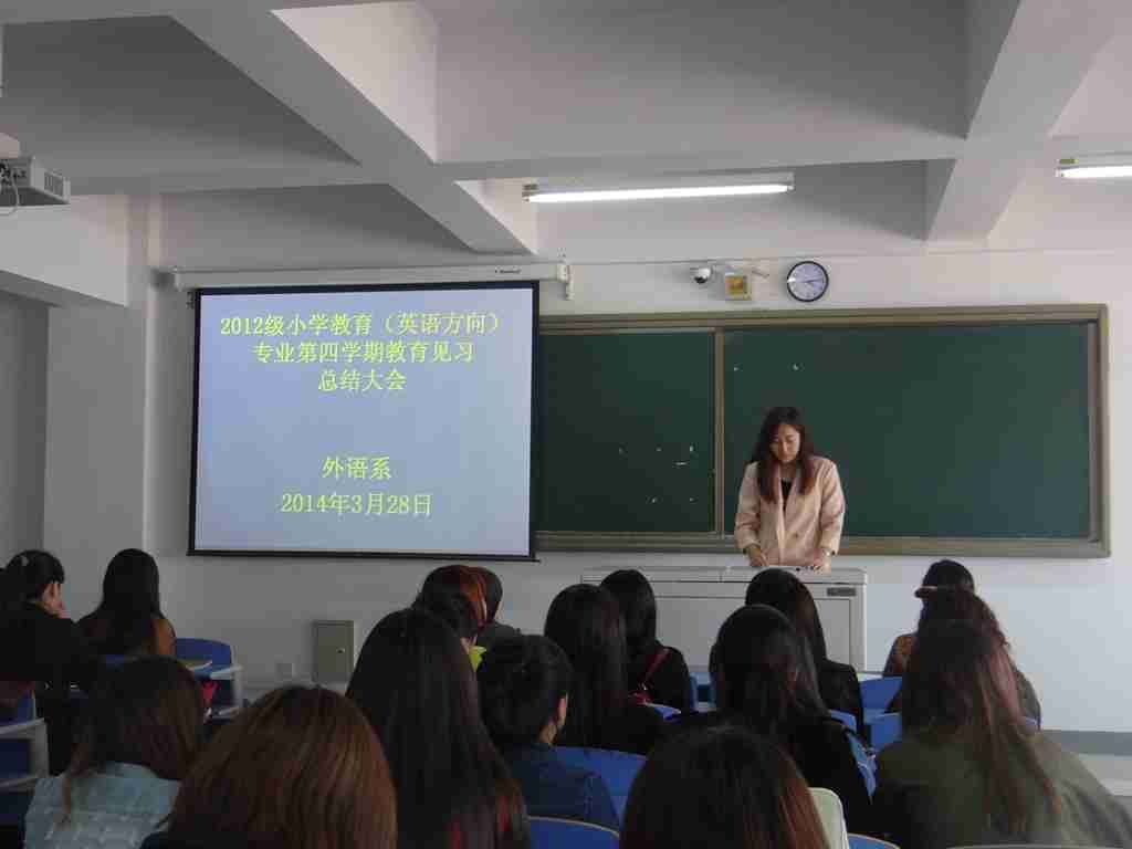 外语系于2014年3月28日下午4:00时在外语系604教室进行了外语系2012级小学教育(英语方向)专业第四学期教育见习总结大会。大会由外语系英语教研室负责人红霞主持,并作见习总结。其后, 2012级小学教育(英语方向)专业一班哈布热同学及2012级小学教育(英语方向)专业二班白南丁同学代表见习生发言,汇报了见习心得与收获。最后,系主任肖查娜老师对见习工作进行了全面总结,并对见习生寄言,希望他们在今后的专业学习上继续努力,不断夯实职业技能,为下一步的专业实践做好充分的准备。
