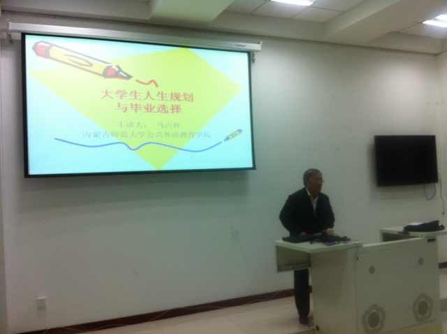 2013年9月28日晚7:30,外语系公共外语教研室教师及部分一年级、三年级学生在新教学楼106教室聆听了内蒙古外语教学研究会会长、内蒙古师范大学马占祥教授的精彩讲座。马占祥教授以“大学生人生规划与毕业选择”为题,就英语专业大学生如何进行生活规划、就业前职业规划及考研和就业的利弊等问题进行了深入的阐释。马老师以一句西方谚语“If you do not know where you want to go, then usually you can not go anywhere ...”引导同学们认识规划和定义的重要性。用生动的故事、现实的例子、多年的经验教给大家“定位决定人生,规划改变人生”的深刻道理。讲座结束后,同学们就感兴趣的话题积极提问,马占祥教授耐心、细致地解答了同学们的问题。