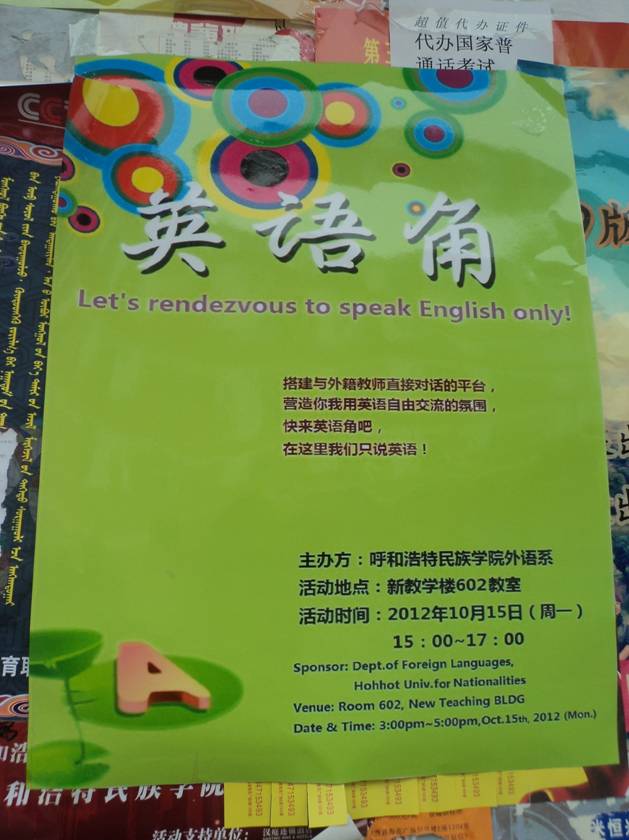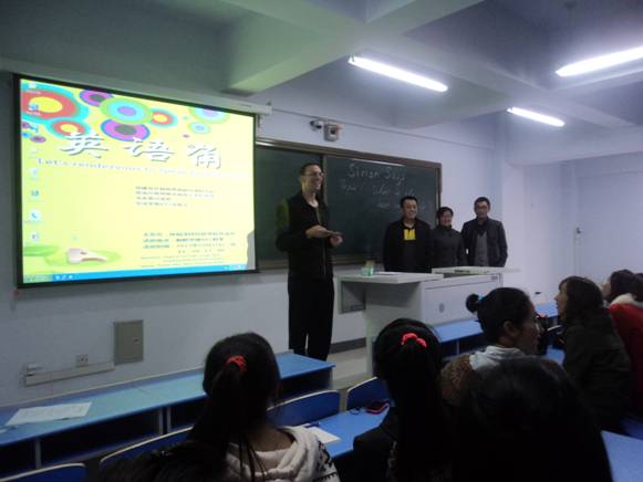 外语系于2012年10月15日下午在全校范围举办了“英语角”活动。活动以分组讨论、英语歌曲表演、趣味游戏为主要内容。有近百名英语爱好者参加了活动。活动中师生们积极交流,热情表演。活动起到了活跃学生业余生活,激发英语学习热情,提高英语应用能力的作用。