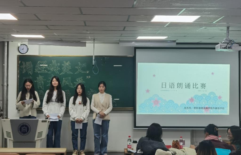 为锻炼同学们的口语表达能力、自我表现能力,展现大学生的专业风采,营造良好的日语学习氛围,12月12日晚7时,外国语学院于尚智楼314教室举办“诵经典美文,展青春风采”日语朗诵比赛。日语教研室何桂花老师、包金兰老师、高乌兰老师、白红梅老师担任本次比赛评委,参赛选手为在校日语专业学生。