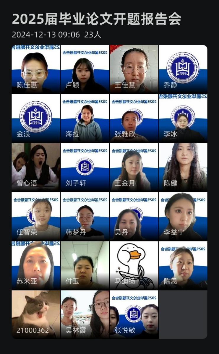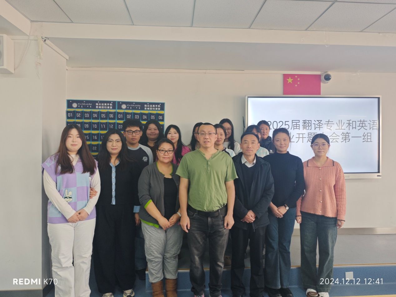 答辩过程中,学生们表示收获颇丰,不仅得到了专家的专业指导,还通过与同学的交流拓宽了研究思路,明确了研究方向。专家们严谨的治学态度和深厚的学术造诣也给学生留下了深刻印象,激发了他们的学术热情。经过紧张有序的答辩,外国语学院2025届翻译专业(英语)开题答辩会圆满结束,师生合影留念。此次答辩会不仅为学生提供了展示成果的平台,更为他们未来的学术研究指明了方向。