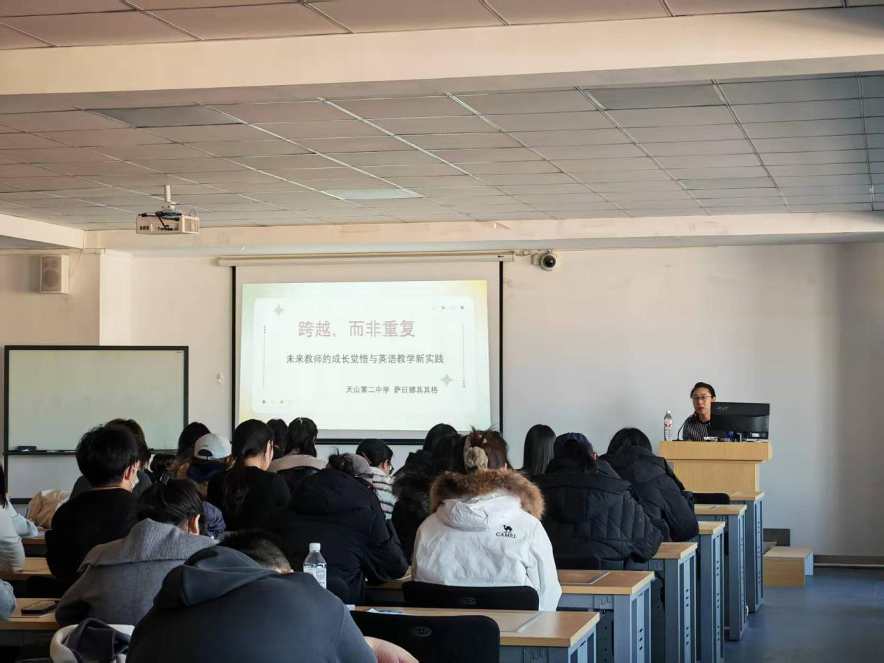 12月25日下午3点,天山第二中学一级教师萨日娜其其格应邀为我院22级英语专业全体同学及英语教育教研室专任教师作题为“跨越,而非重复——未来教师的成长觉悟与英语教学新实践”的专题讲座。讲座在都林楼606智慧教室举行。