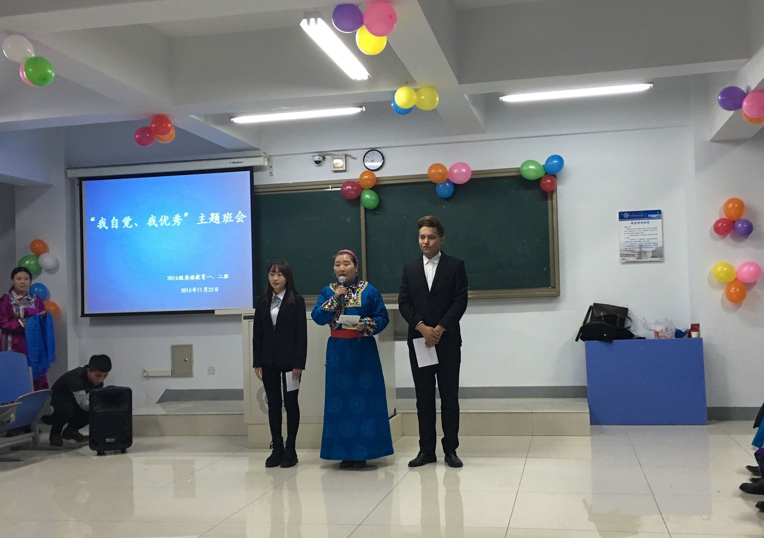 2016年11月22日晚7点30分,外语系2016级英语教育一、二班在都林楼502教室共同举办了《心系本科评估•情牵学校发展》之“我自觉 我优秀”主题班会。出席此次主题班会的领导老师有外语系党总支书记布和朝鲁、副书记红梅,学生工作处副处长包仓、公寓管理中心主任白龙,管理系团总支负责人李云、外语系办公室负责人斯琴及班主任韩争运老师。