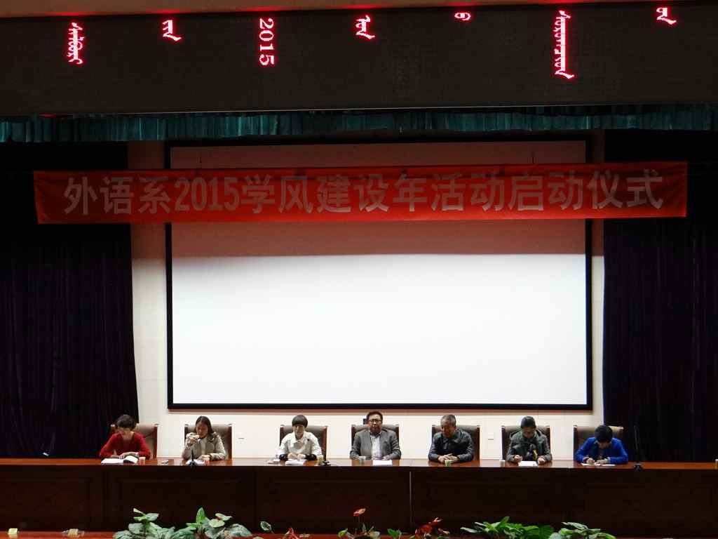 为加强外语系学风建设,提高大学生遵守校纪校规的自觉性,促使学生进一步端正学习态度,提高学生的综合素质,促进学生的成人成才,2015年3月28日上午,外语系在图书馆二楼报告厅召开了2015学风建设年活动启动仪式。外语系党总支书记布和朝鲁教授、主任肖查娜教授、全体师生共500余人参加了本次会议。会议由系党总支副书记红梅主持。