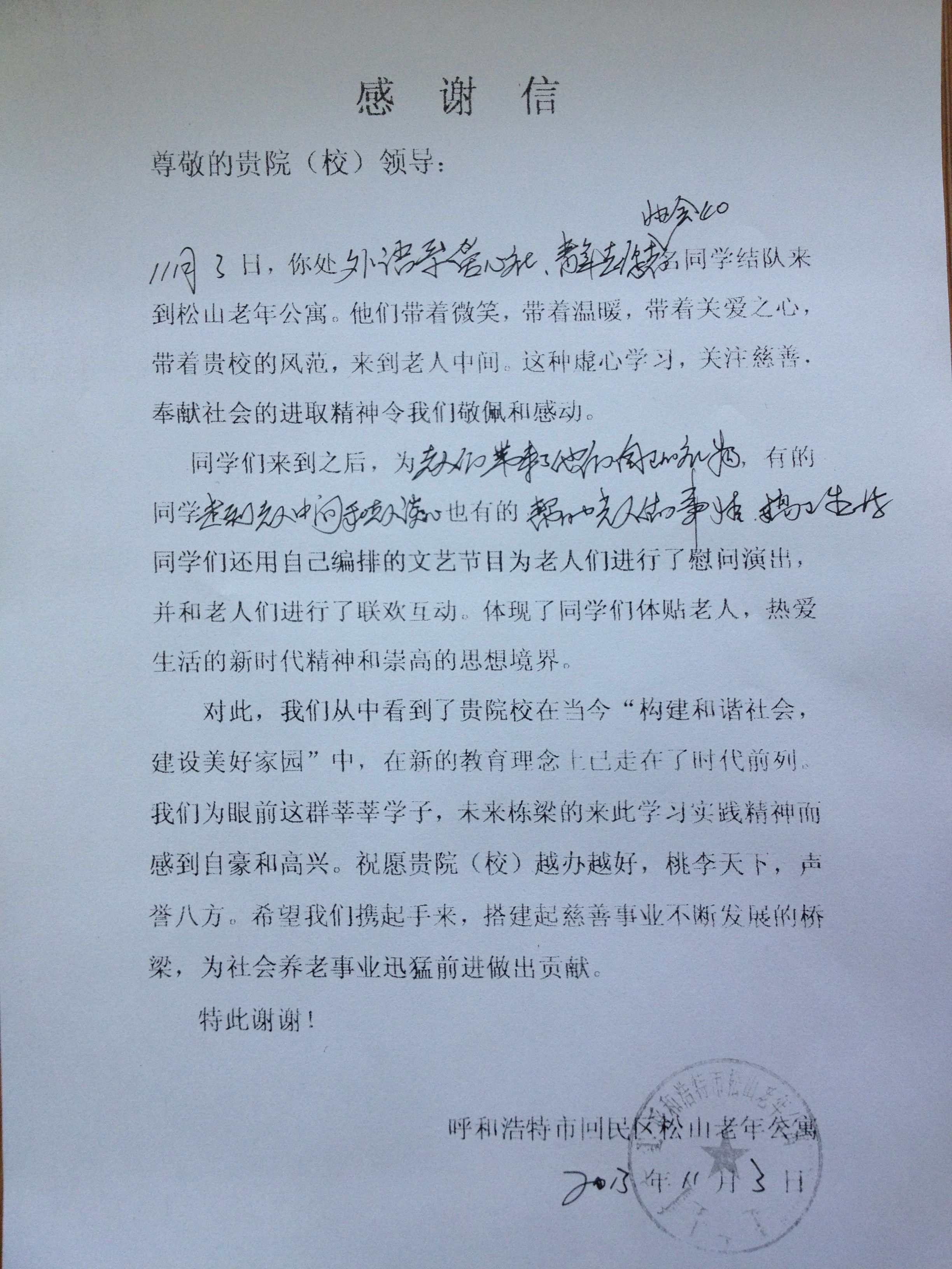 外语系团总支于2013年11月3日上午9:20-11:30组织我系青年志愿者大队、爱心社40名志愿者,在系学生会副主席张布和吉日嘎拉的带领下赴呼市松山老年公寓开展了慰问演出活动。同学们精心准备了17个节目,老人们在优美的歌声,欢快的舞蹈中度过了一个难忘的周末。