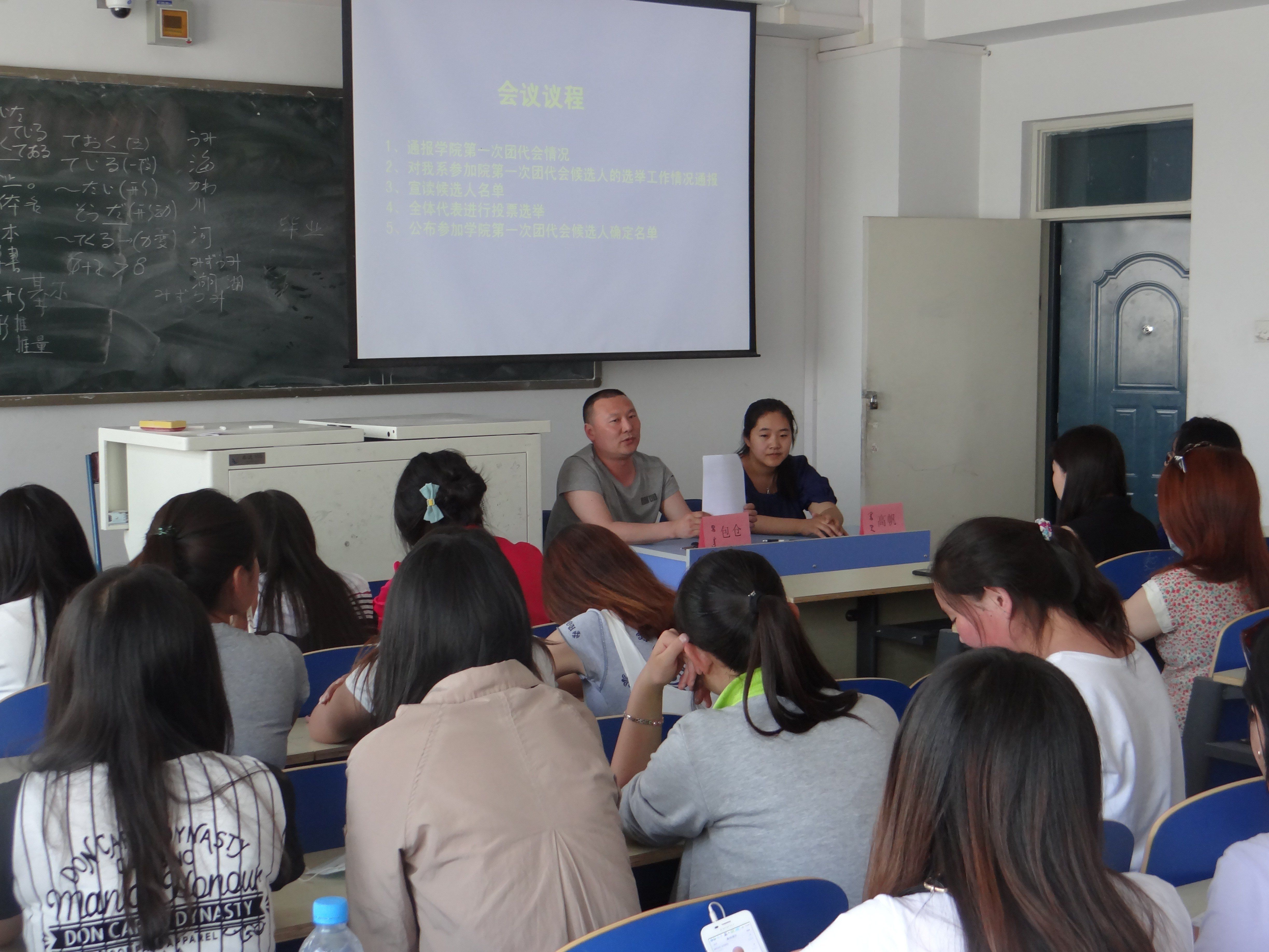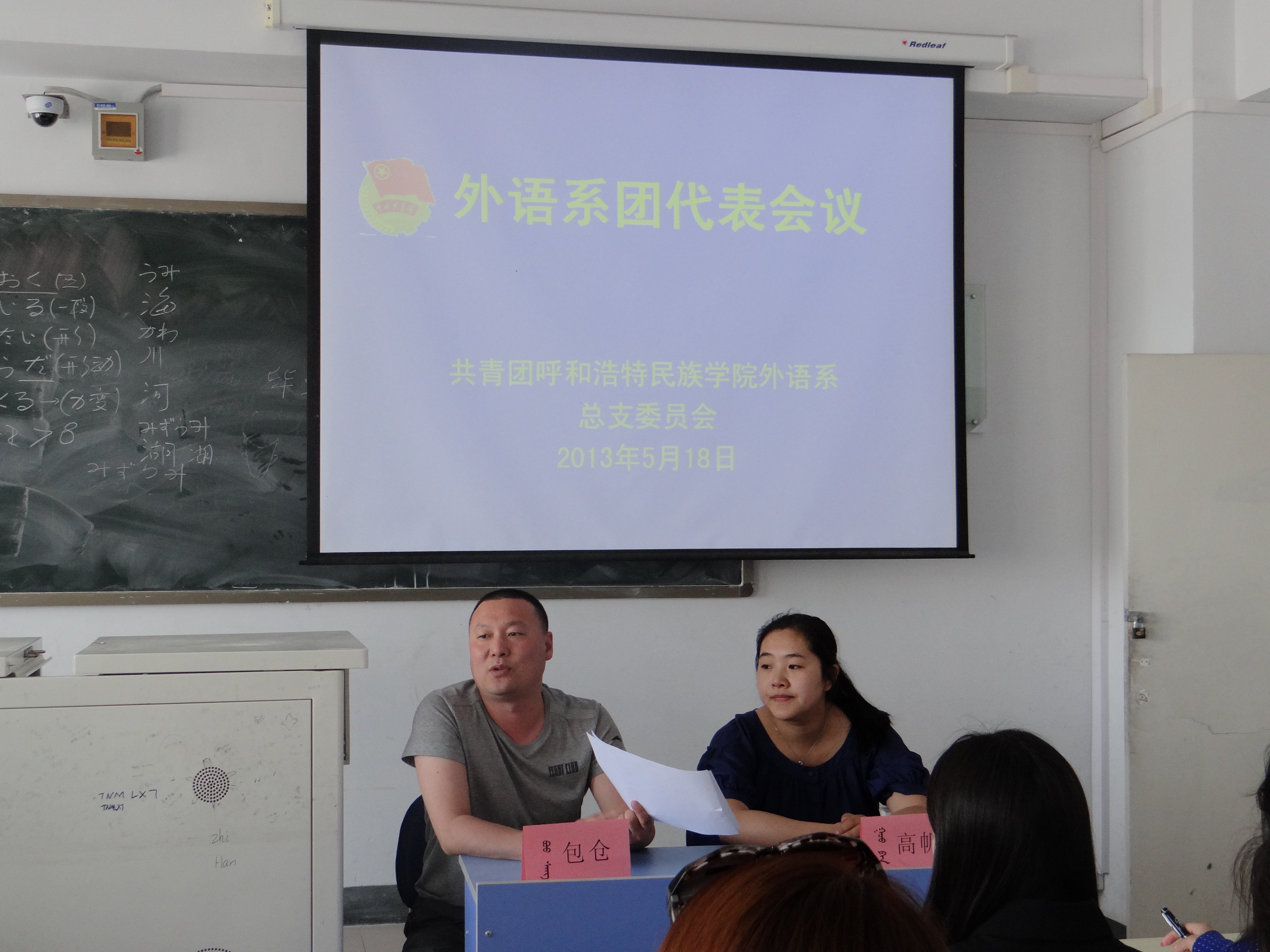 2013年5月18日中午12点30分,外语系团总支召开了共青团团员代表会议。外语系团总支书记包仓、团总支助理高帆以及各班级团员代表共42人出席了本次代表大会。