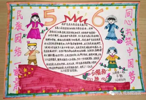 为全面贯彻党的民族政策,深化民族团结进步教育,铸牢中华民族共同体意识,外国语学院于9月23日举办“民族一家亲”手抄报比赛,通过创作手抄报的形式引导学生了解各民族的特色文化、风俗习惯,加深各民族学生对其他民族文化的了解,增进彼此感情,引导学生树立正确的国家观、历史观、民族观,增强学生对中华民族的认同感和自豪感。