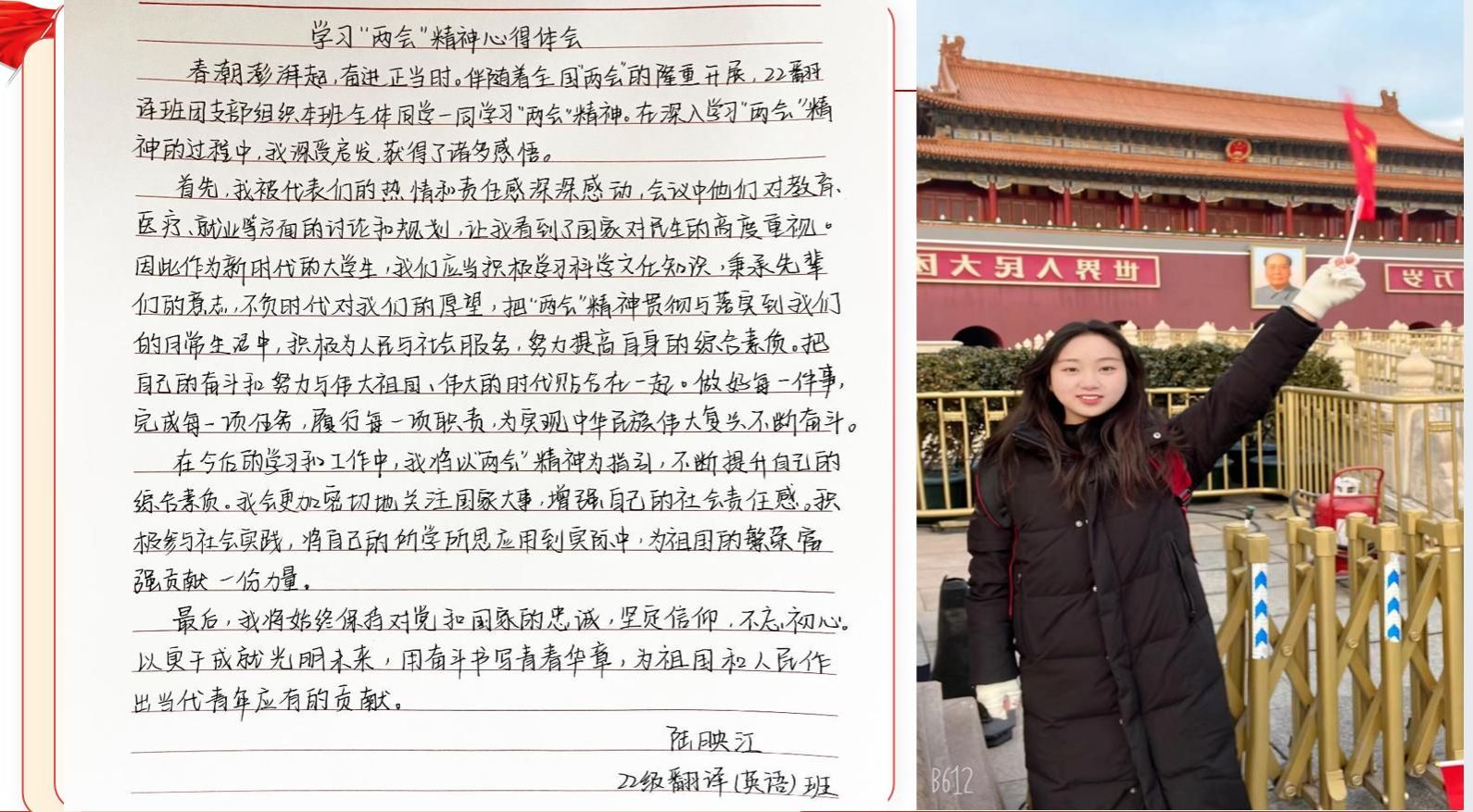 为更好的学习贯彻“两会”精神,提高大学生的政治觉悟,把“两会”精神与学习生活结合起来,从而坚定理想信念,明确学习目标,外国语学院团总支于3月11日—3月14日组织全院团支部开展“学习两会精神,践行青年担当”主题团日活动。