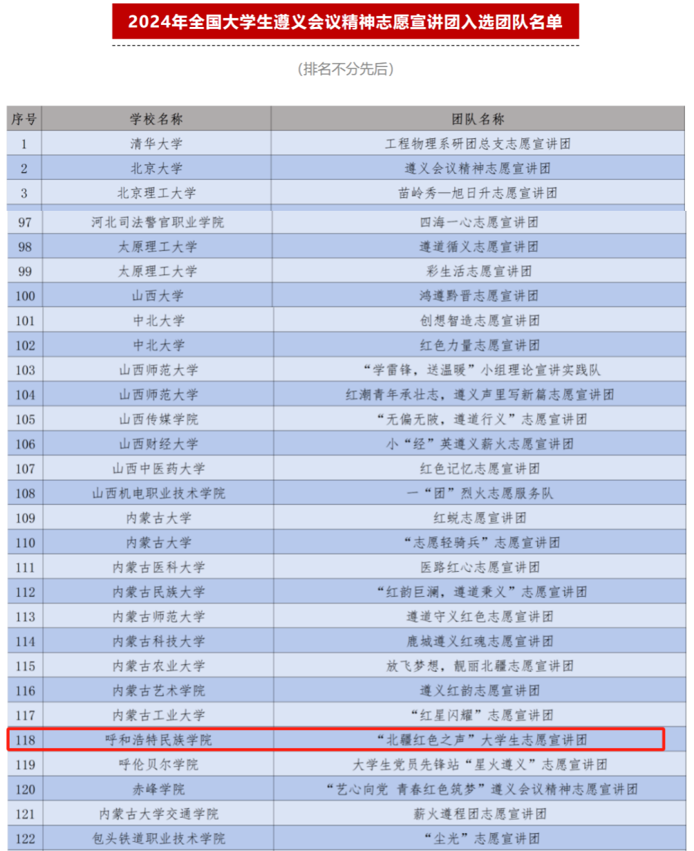 据悉,本次活动得到了各高校志愿服务团队的广泛关注和积极参与。主办单位对所有材料进行了认真审阅,最终共有来自南开大学、四川大学、兰州大学等722所高校的1000支大学生志愿服务团队入选,内蒙古自治区14支团队入选。由我院雷旭平老师指导、黄卫秀等10名学生组队申报的“北疆红色之声”大学生志愿宣讲团成功入选,这也是今年我院入选的第二个全国性学生志愿服务活动团队。