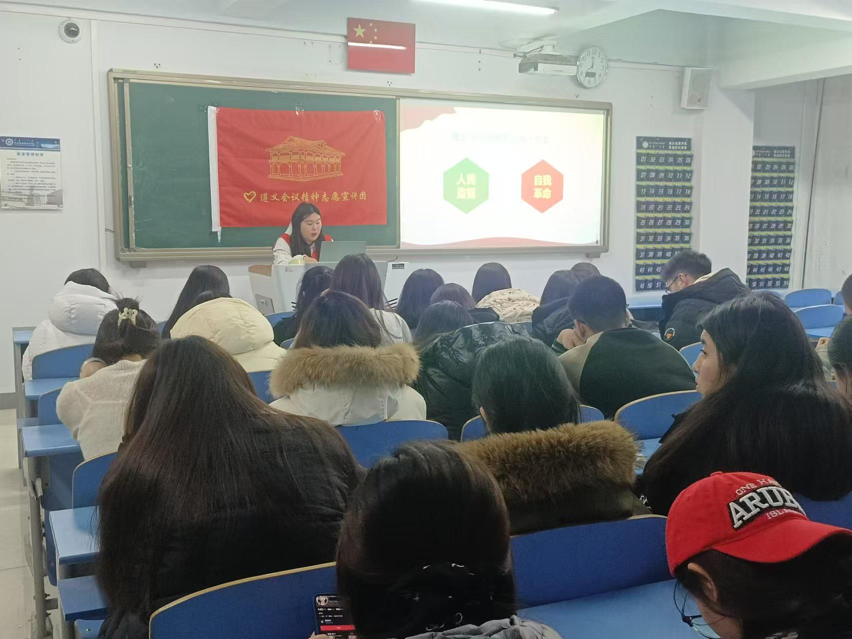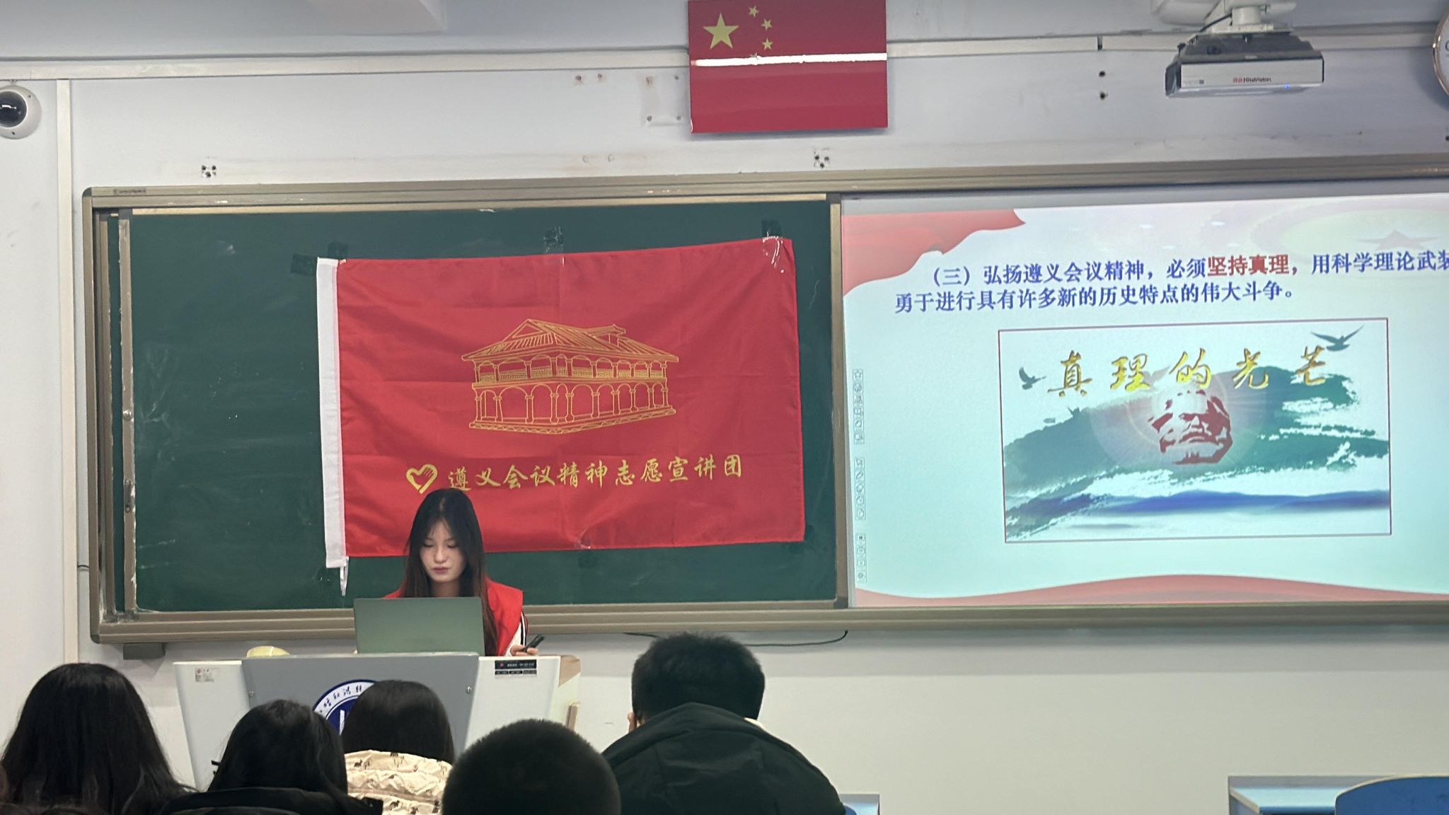 宣讲环节,宣讲团卢雪、赵亚妮、焦春三位同学带着对历史的深刻理解和对宣讲的热情,以饱满的精神状态,将遵义会议那段波澜壮阔的历史娓娓道来。她们不仅详细讲述了遵义会议的基本过程和历史意义,深入剖析了遵义会议精神的主要内涵,让在场的每一位学生都仿佛置身于那个决定中国命运的历史时刻。