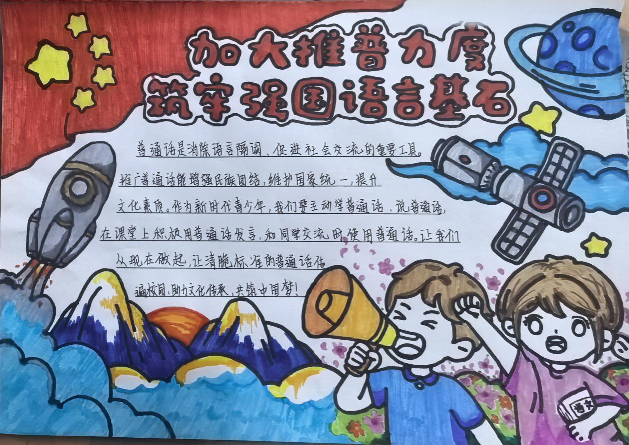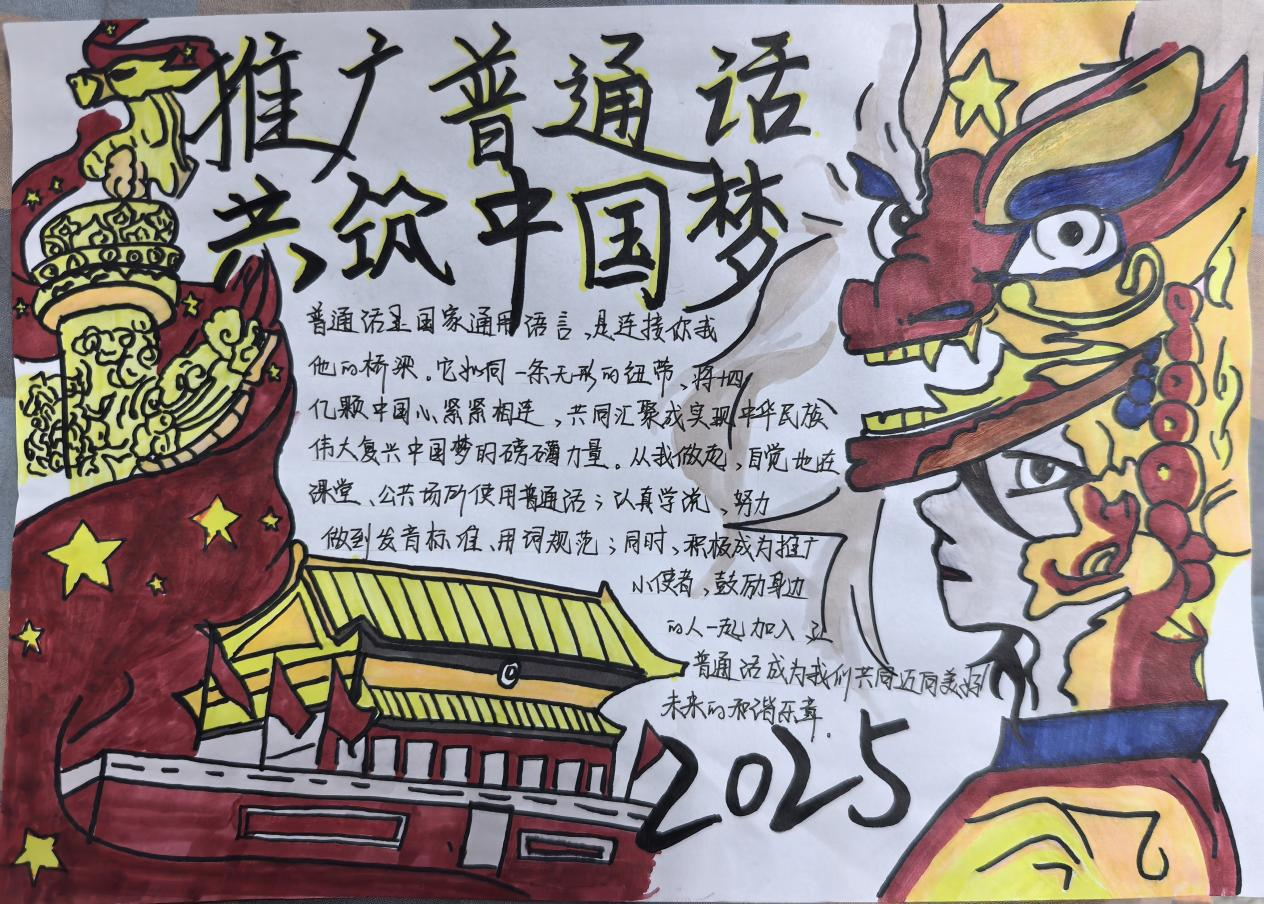 活动开展过程中,同学们踊跃参与。同学们围绕主题,精心构思、巧妙设计,将对普通话的理解与对中国梦的憧憬融入笔尖。作品内容丰富多样,有的通过生动的漫画讲述普通话在日常交流中的重要性;有的以文字阐述普通话作为文化桥梁,凝聚实现中国梦的力量;还有的结合历史与现实,展现普通话从推广到普及,见证国家发展与民族复兴的历程。在设计上,同学们运用色彩搭配、版面布局等技巧,让每一份手抄报既富有知识性,又具备较强的视觉冲击力,充分展现了新时代学生的创造力与使命感。