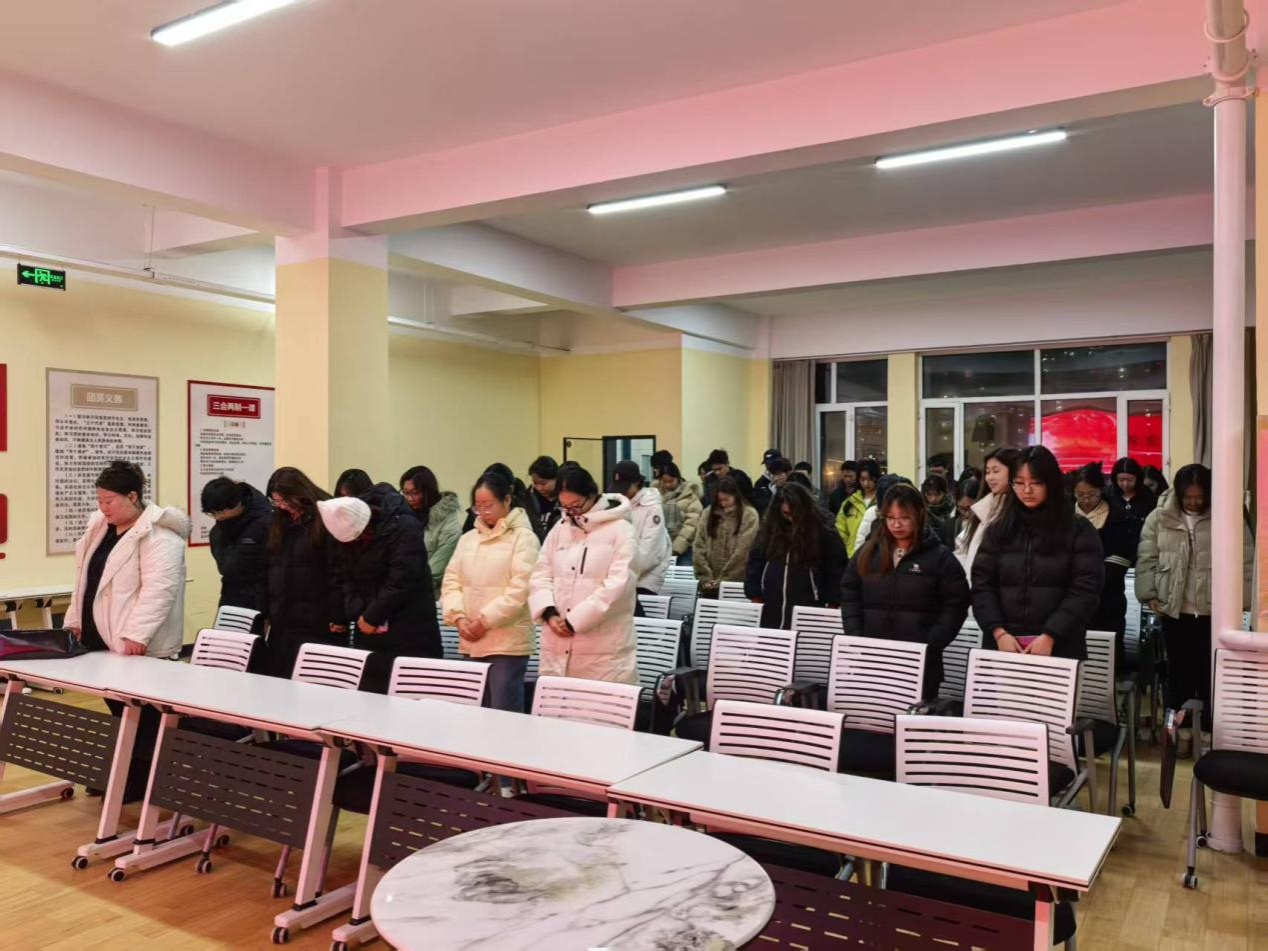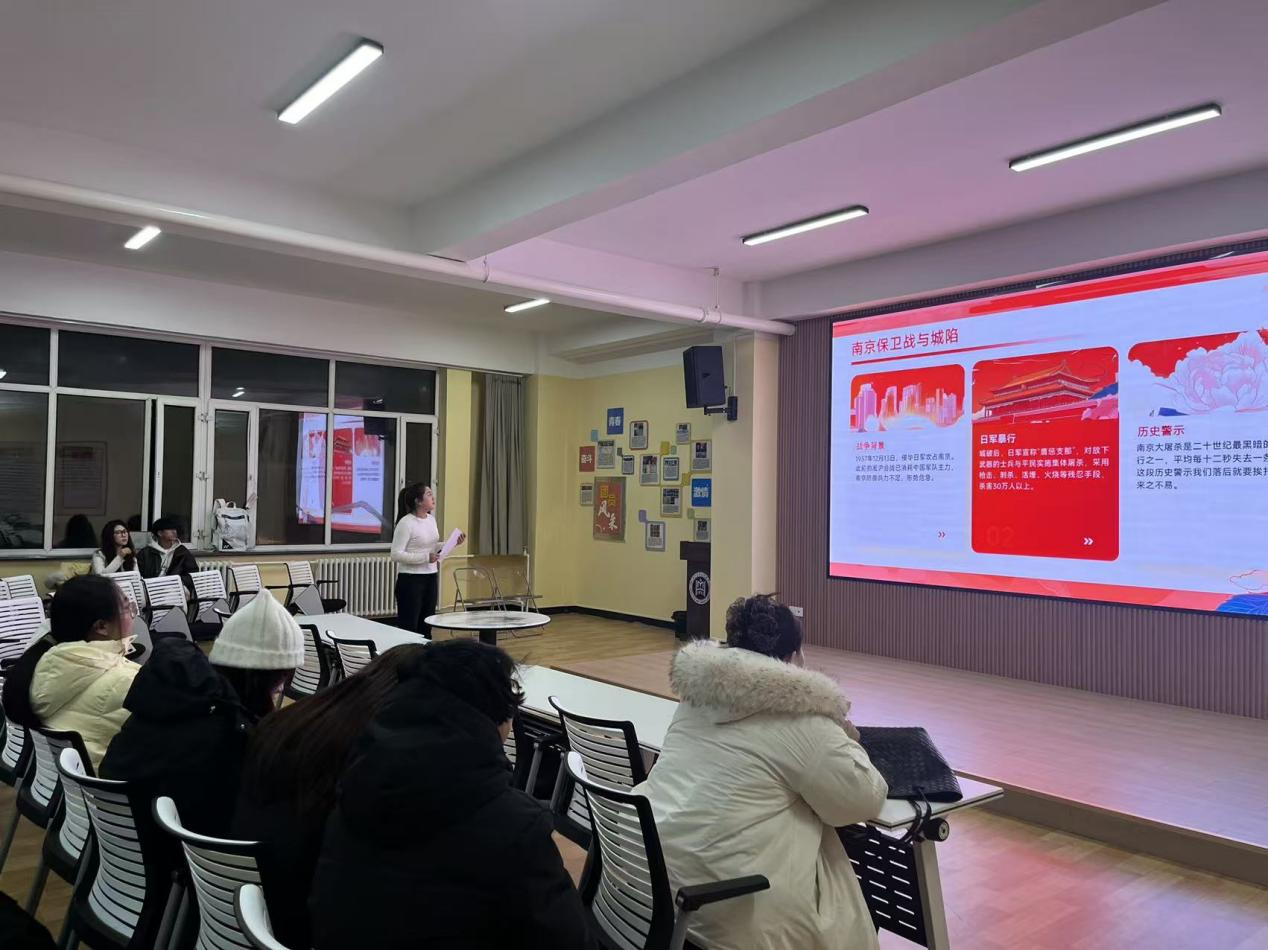 活动伊始,全体人员起立默哀1分钟,以肃穆仪式追思南京大屠杀遇难同胞。随后,主讲负责人杨小娟结合专题PPT,清晰讲解国家公祭日设立背景与南京大屠杀核心史实,权威传递历史真相,围绕“历史与青春担当”进行宣讲,发言基于权威史料、情感真挚,引发全场共鸣。活动最后,负责人总结活动意义,明确国家公祭网线上献花打卡要求,全体人员肃立致意后有序散场。