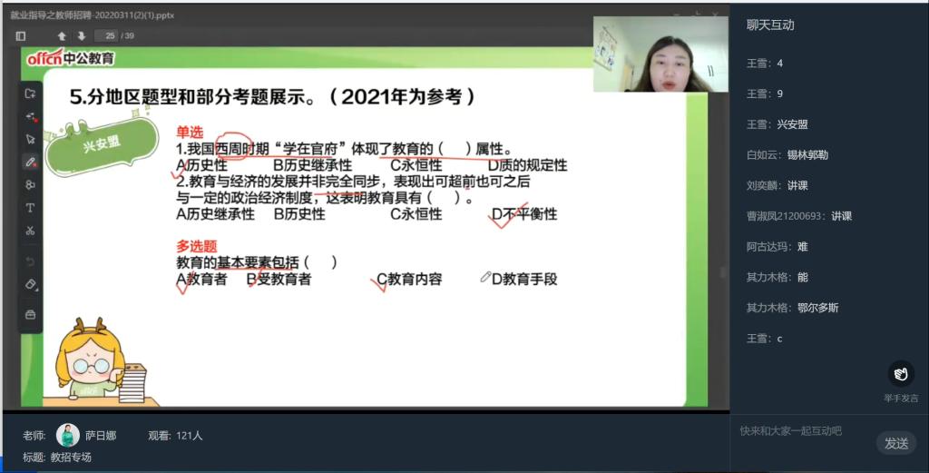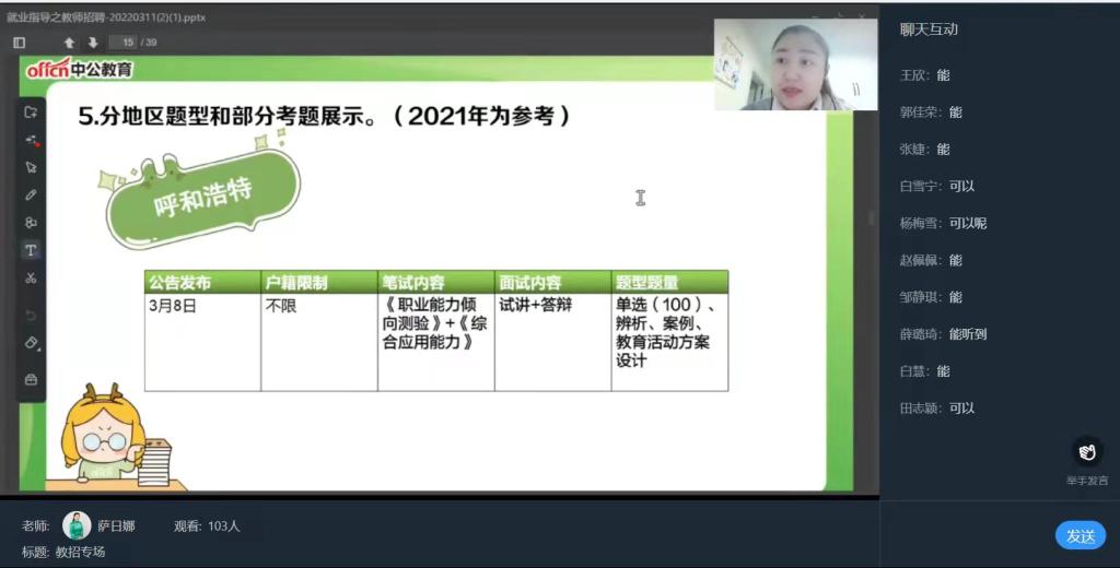 讲座邀请中公教育萨日娜老师进行主讲。萨日娜老师首先对内蒙古各地区教师招聘考试政策进行解读,并详细介绍了现阶段教师招聘考试中笔试和面试的要求及注意事项。随后,通过对各地区部分考题的讲解,系统全面地分析了内蒙古各地区的考情以及备考思路。最后,萨日娜老师与学生进行交流,为有参加教招考试意向学生进行了答疑解惑。讲座结束后,学生们纷纷表示此次讲座为教招考试指明复习方向,受益匪浅。