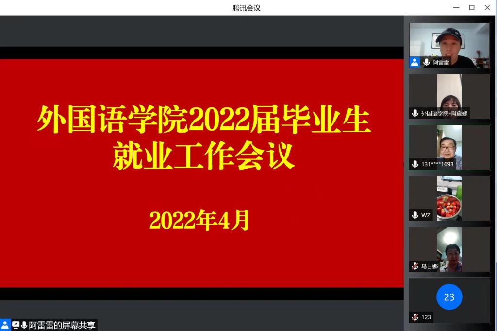 为全面推进学院毕业生就业工作,外国语学院于4月4日晚7时在腾讯会议平台召开2022届毕业生就业工作推进会议。学院党总支书记布日古德、院长肖查娜、副书记红梅、副院长陈玉红、2022届毕业班班主任、辅导员和学院全体教师参加了会议,会议由2022届毕业班辅导员雷旭平主持。