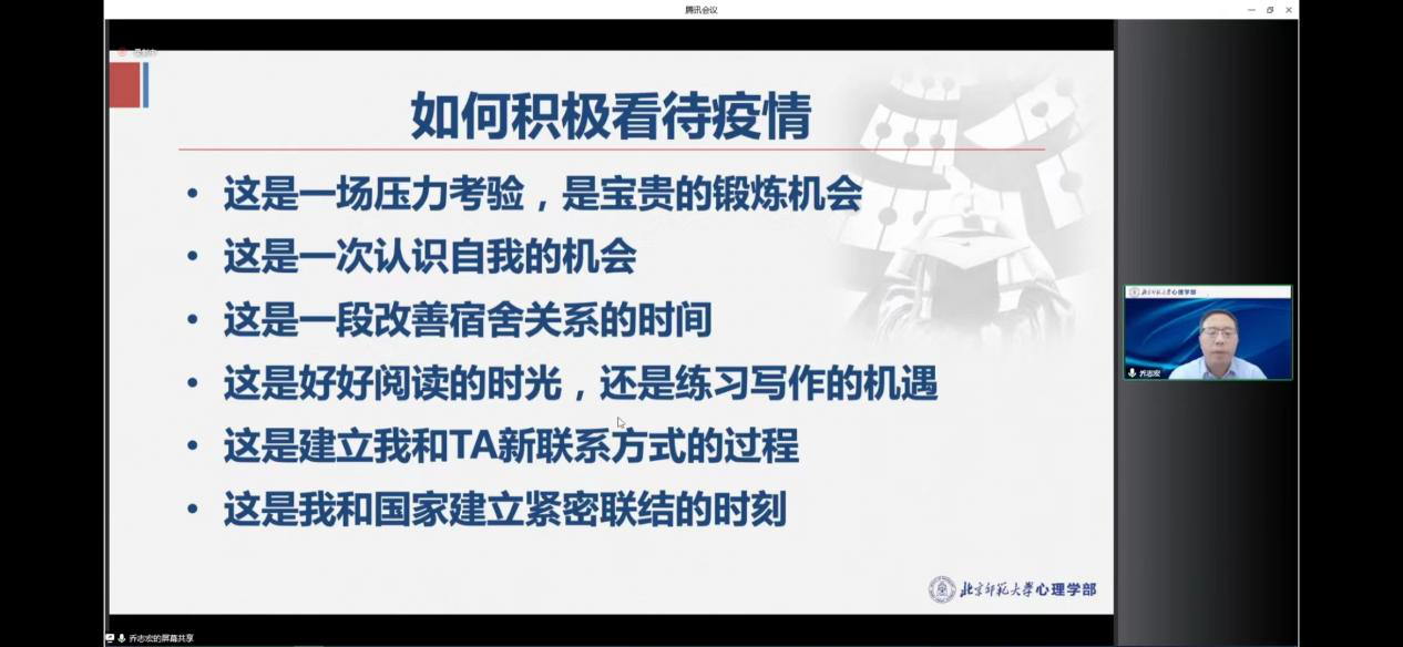 此次活动,学校邀请中国心理卫生协会大学生心理咨询专业委员会常务理事、北京师范大学心理学院分党委书记、北京师范大学学生心理咨询与服务中心主任、博士生导师乔志宏研究员以“疫情期间的心理健康维护”为题,为全校师生讲授了心理健康教育大课。课上,乔志宏研究员从心理健康的基础知识、疫情对心理健康的影响、疫情下心理健康的自我维护等三个方面分析疫情防控期间常见的心理健康问题,引导学生正确认识和对待疫情防控措施,传授积极健康的应对方法,帮助学生缓解紧张情绪、建立积极健康的心理状态,并给出建设性的心理健康维护意见和建议,有效服务到自我管理核心能力提升。课程受到师生热烈反响,全校近一万名师生以线上形式参与心理健康教育活动,校内外25058人次同步观看,点赞数达到91167人次。