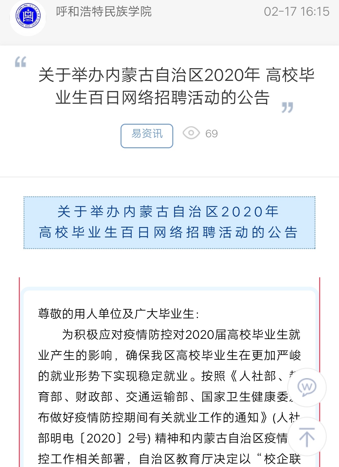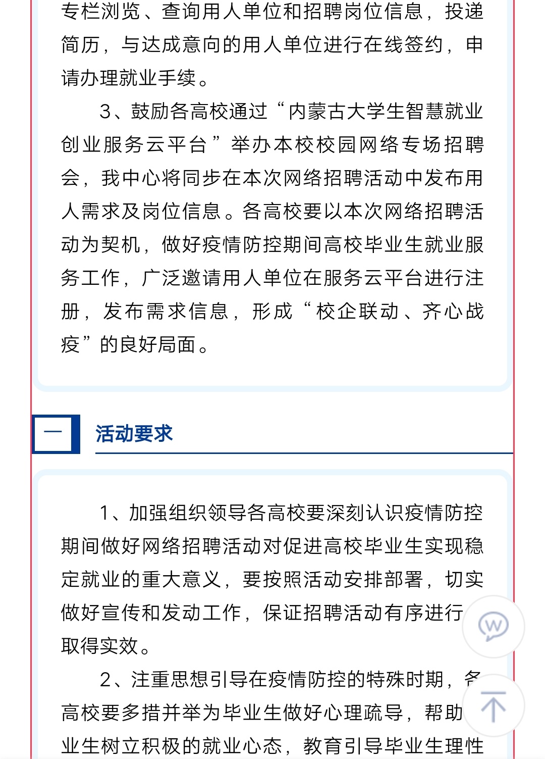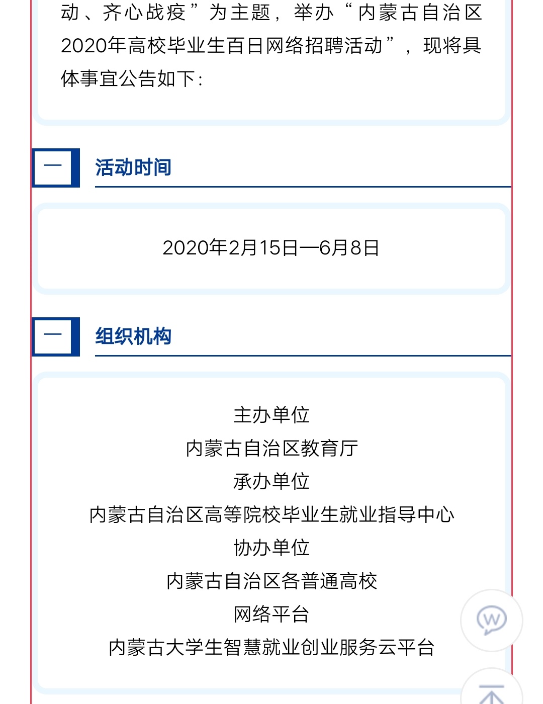 关于举办内蒙古自治区2020年 高校毕业生百日网络招聘活动的公告