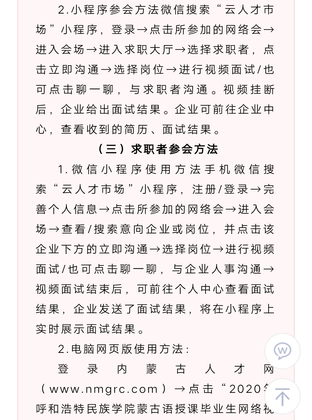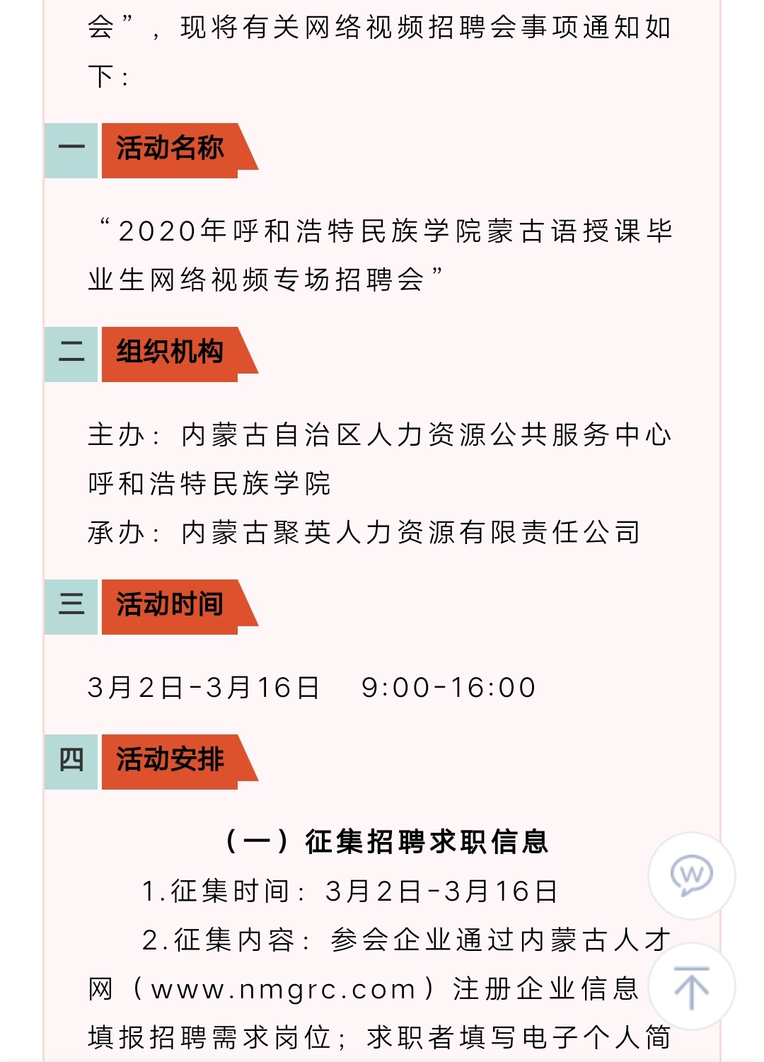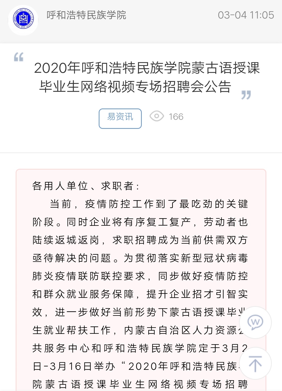 2020年Beat365唯一官方网站蒙古语授课毕业生网络视频专场招聘会公告