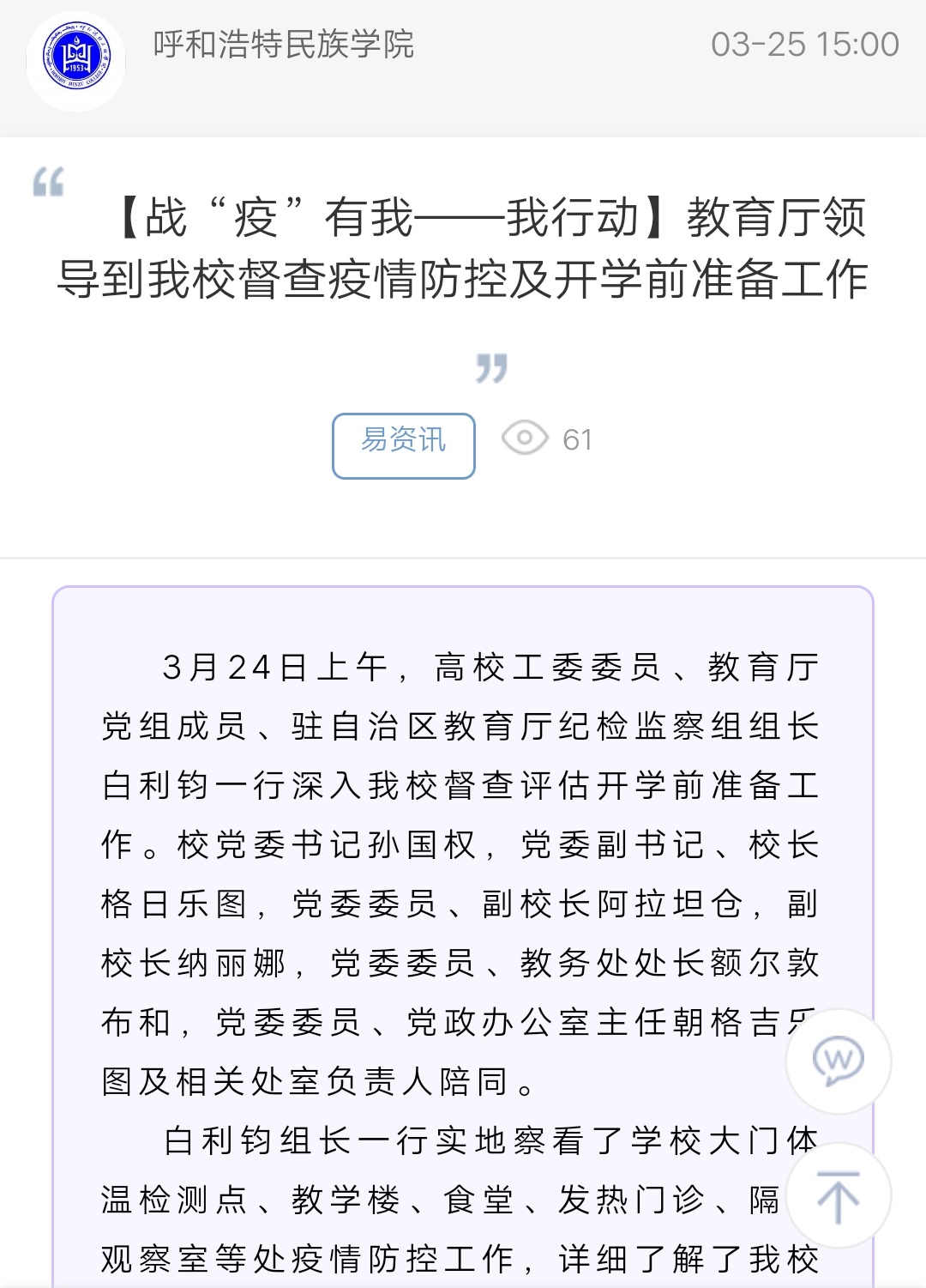 【战“疫”有我——我行动】教育厅领导到Beat365督查疫情防控及开学前准备工作