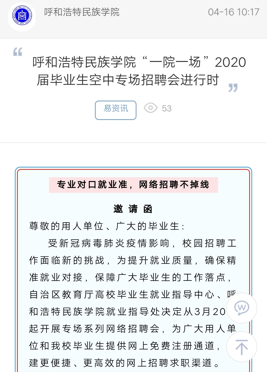 Beat365唯一官方网站“一院一场”2020届毕业生空中专场招聘会进行时