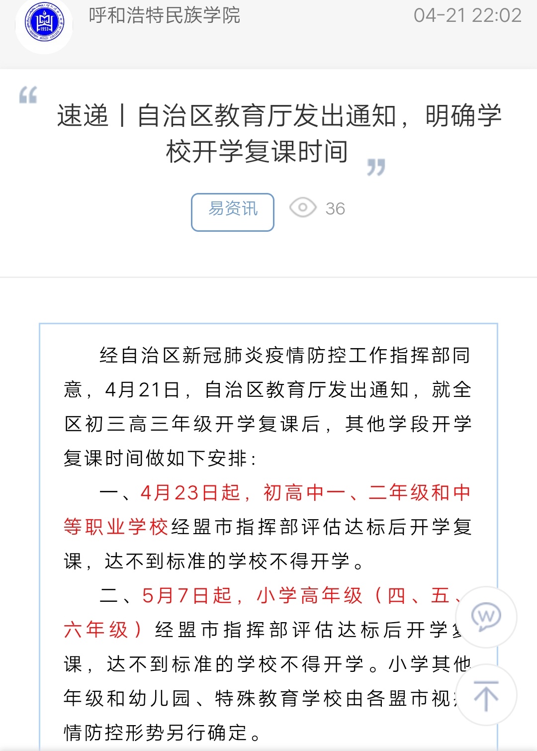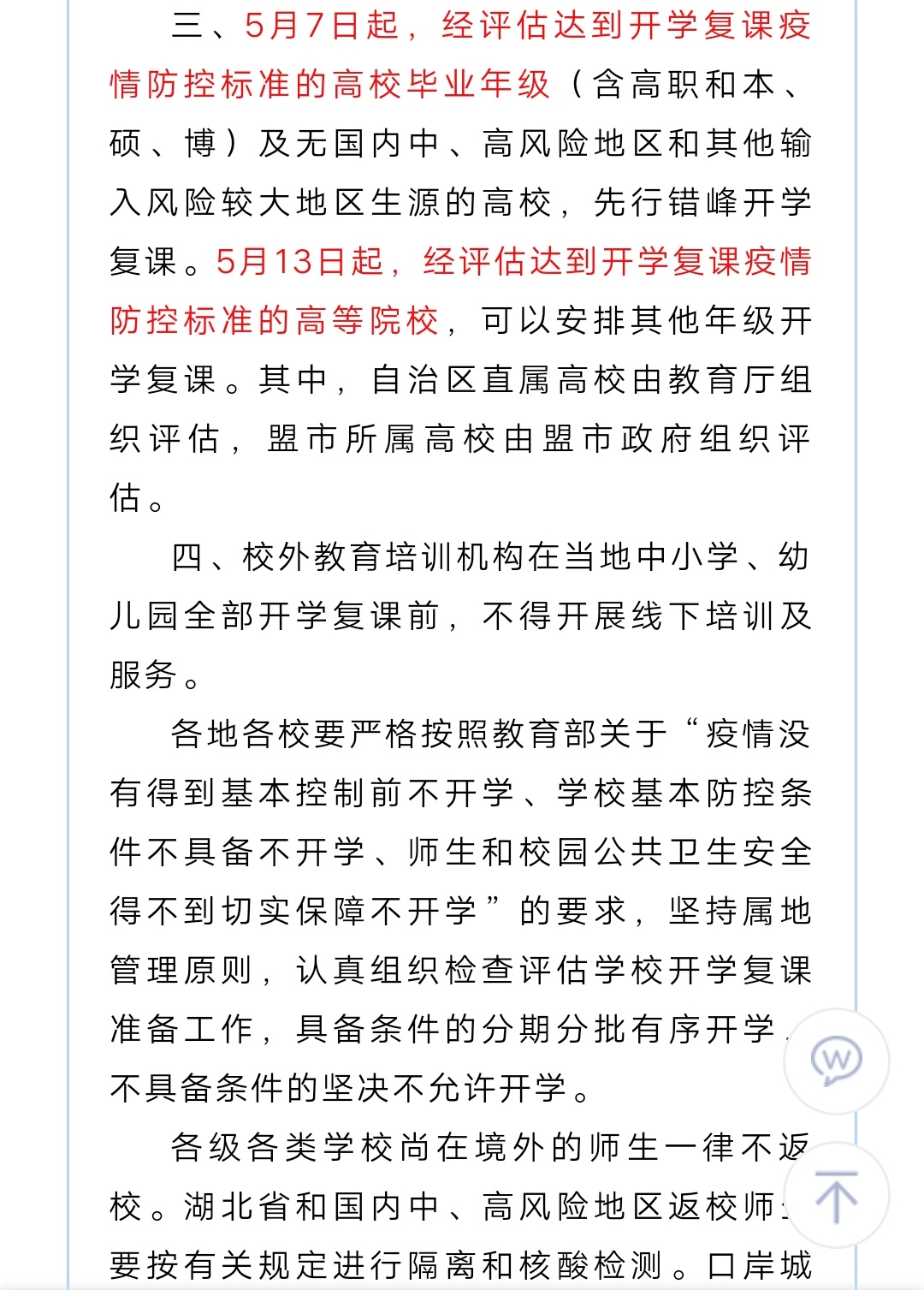 速递丨自治区教育厅发出通知,明确学校开学复课时间