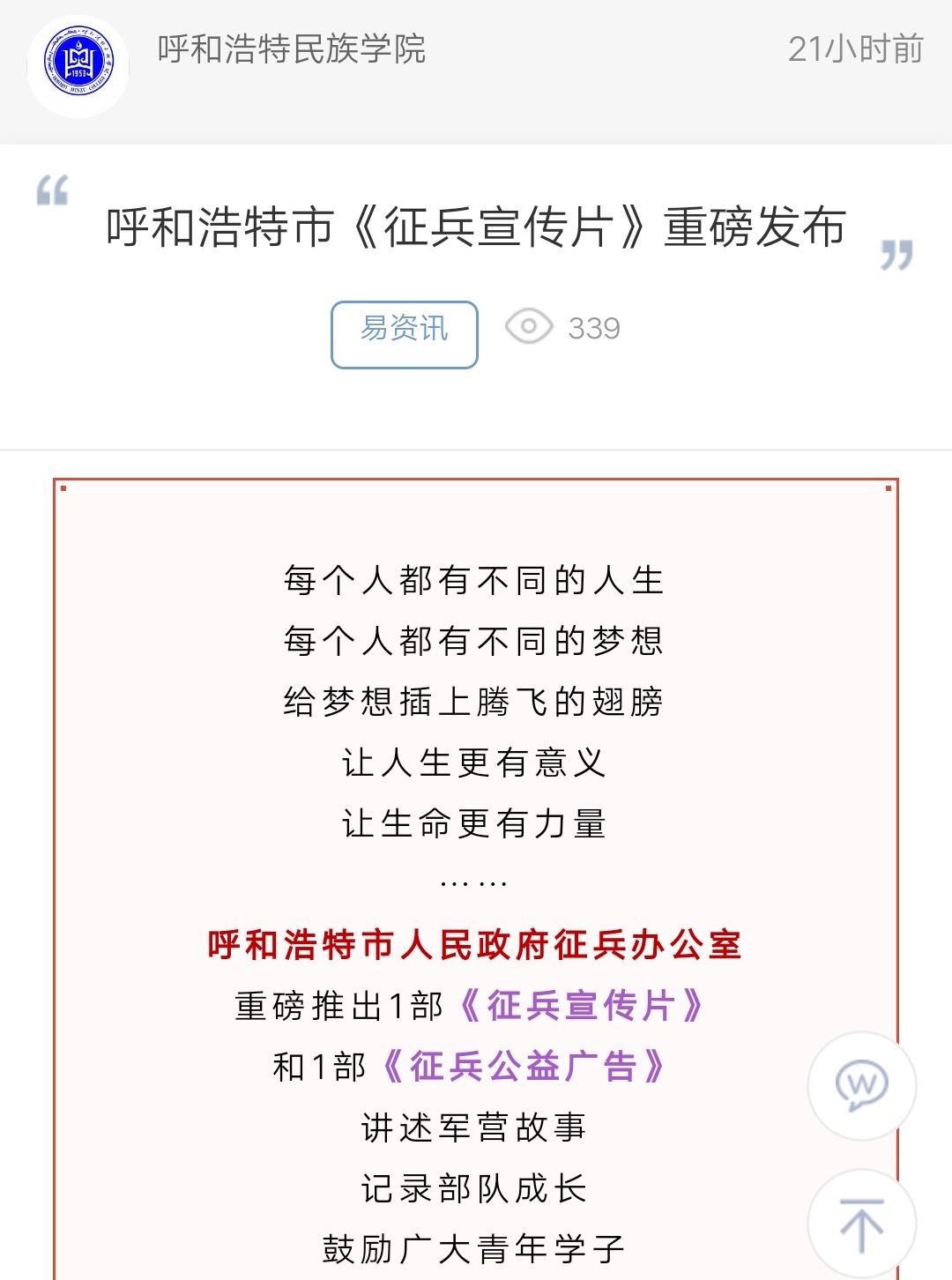 呼和浩特市《征兵宣传片》重磅发布