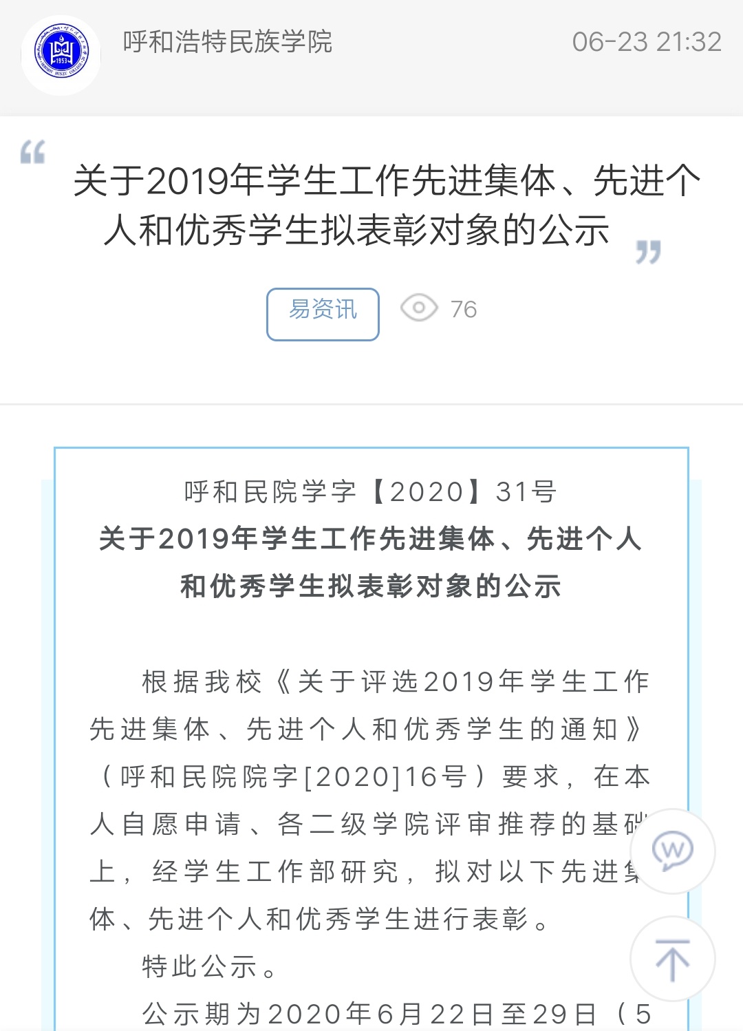 关于2019年学生工作先进集体、先进个人和优秀学生拟表彰对象的公示