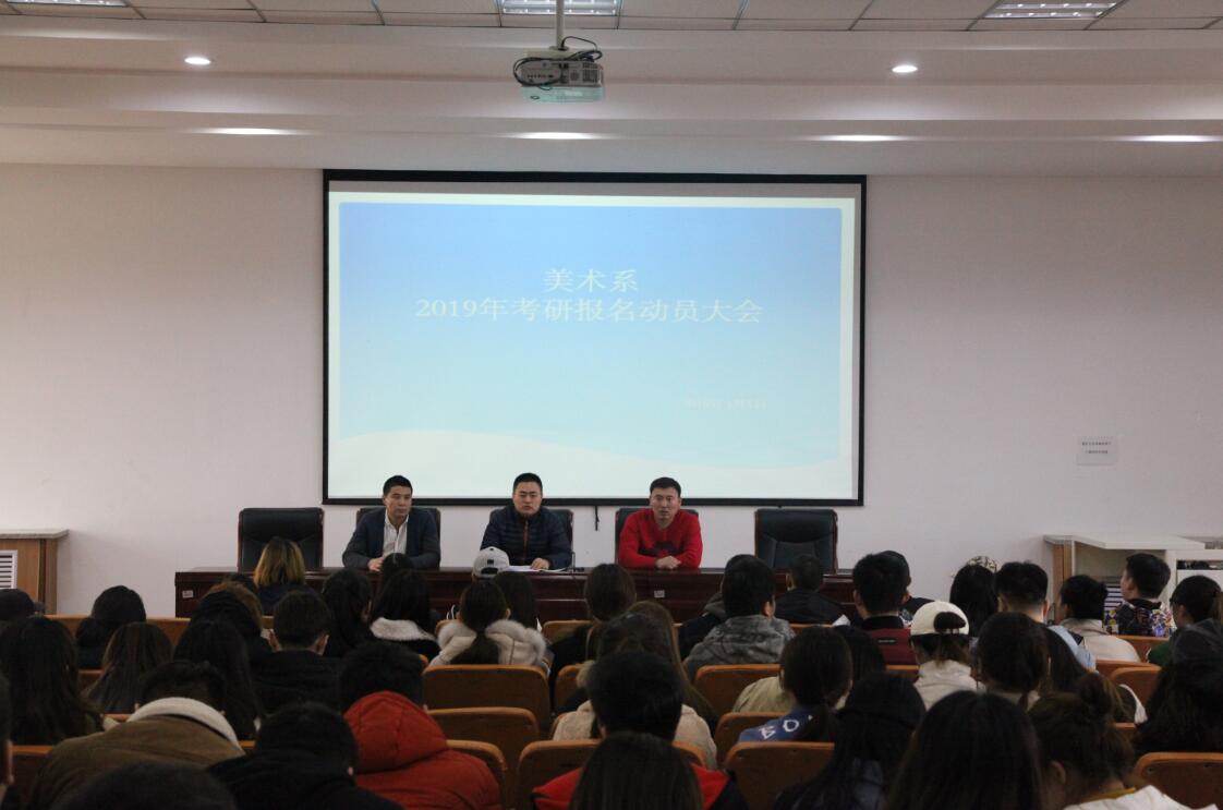 为进一步调动美术系2016级学生考研积极性,力求在2019年研究生考试中有新的突破。3月1日下午,美术系在美术楼四楼阶梯教室召开了2019年考研动员暨2018年考研总结大会。美术系副主任高特木乐主持会议,美术系2016级全体班主任、辅导员以及2016级全体学生参加了动员大会。