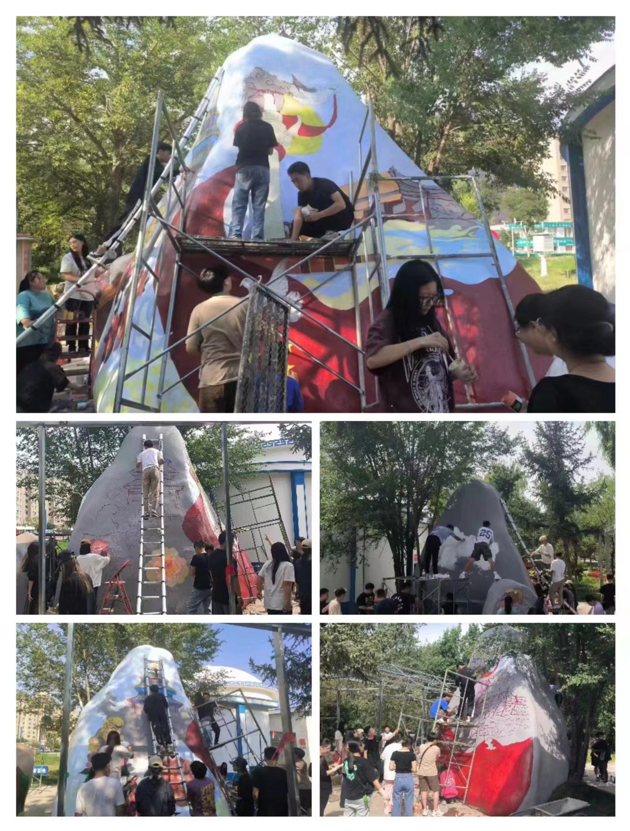 “红石榴”志愿服务主题公园坐落于通道北街和成吉思汗大街交汇处西北角。园内设有同心广场、红石榴造型雕塑、北疆文化长廊等多个宣传载体,其中四面菱形高达六米的中华文化符号景观石的彩绘工作由我院团总支书记魏伟带领党员志愿者服务队累计120余人次,历时15天,累计服务时长2000小时完成。志愿服务队根据内蒙古北疆志愿服务联合会的需求,本着弘扬“奉献、友爱、互助、进步”的志愿服务精神,利用每天课余时间,科学统筹、合理安排,分工明确,提前定稿,做好前期准备工作;开工后又遇暴雨冲刷,重新返工,全力补救,几经艰辛,完美呈现出天安门广场、天坛公园、万里长城等最具代表性的画面。