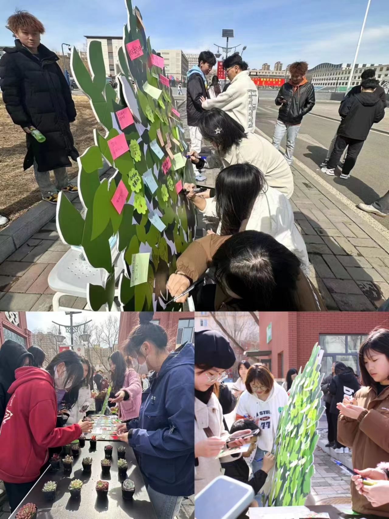 本次活动包括“线上答题送绿植”、“禁止焦‘绿’”写寄语等环节。在和煦温暖的春日阳光中,现场同学们都积极踊跃参与到活动中来,答题时刻气氛热烈;同学们以“春暖花开 •‘植’得期待”为主题,将自己对植树造林、环境保护、未来期待等美好向往的寄语贴到大树上,并以签名的方式为本次活动留下自己的印迹。