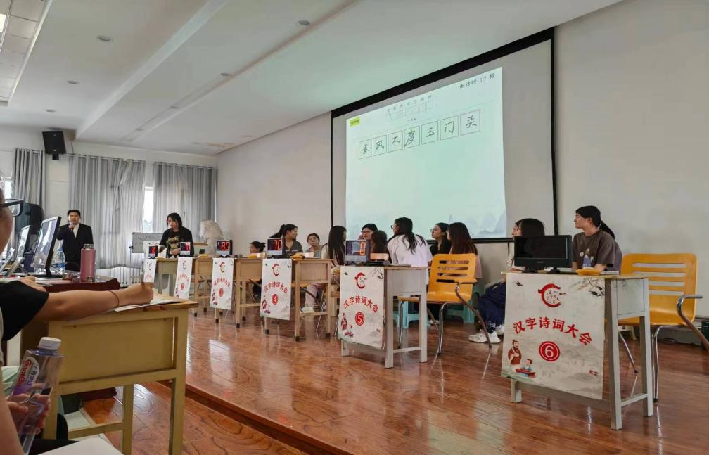 比赛分为四个环节,选手们通过“小试牛刀”“点字成诗”等环节展现了扎实的汉字功底,赢得了观众阵阵掌声。“眼疾手快”环节更是考验了选手们的快速反应和书写能力,现场气氛紧张而激烈。比赛间隙,乌雅汗同学为大家献上了悠扬的歌曲,有效缓解了现场紧张的氛围,为大家带来了一丝轻松与愉悦。