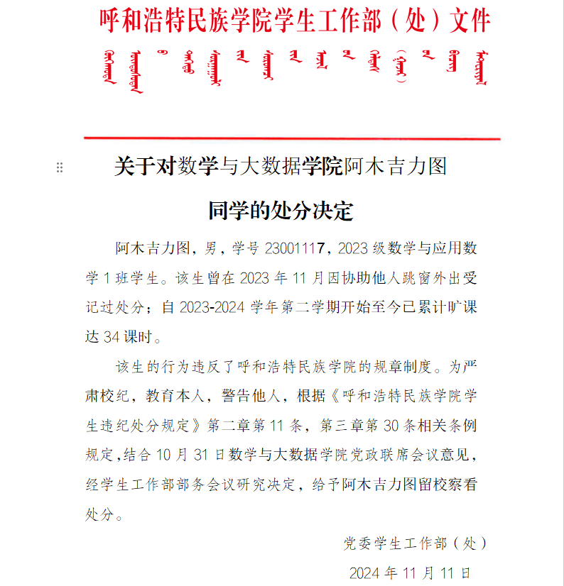 关于对数学与大数据学院阿木吉力图同学的处分决定