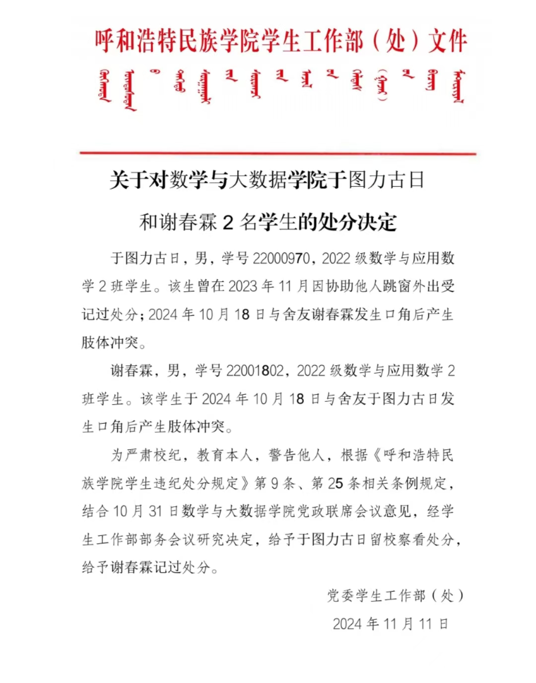 关于对数学与大数据学院于图力古日和谢春霖2名学生的处分决定