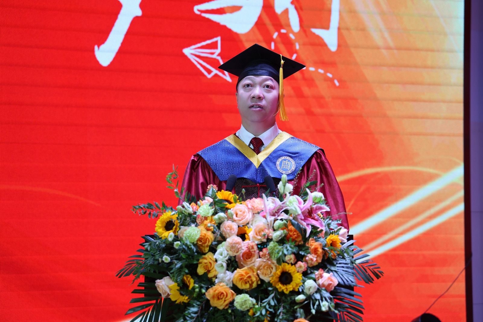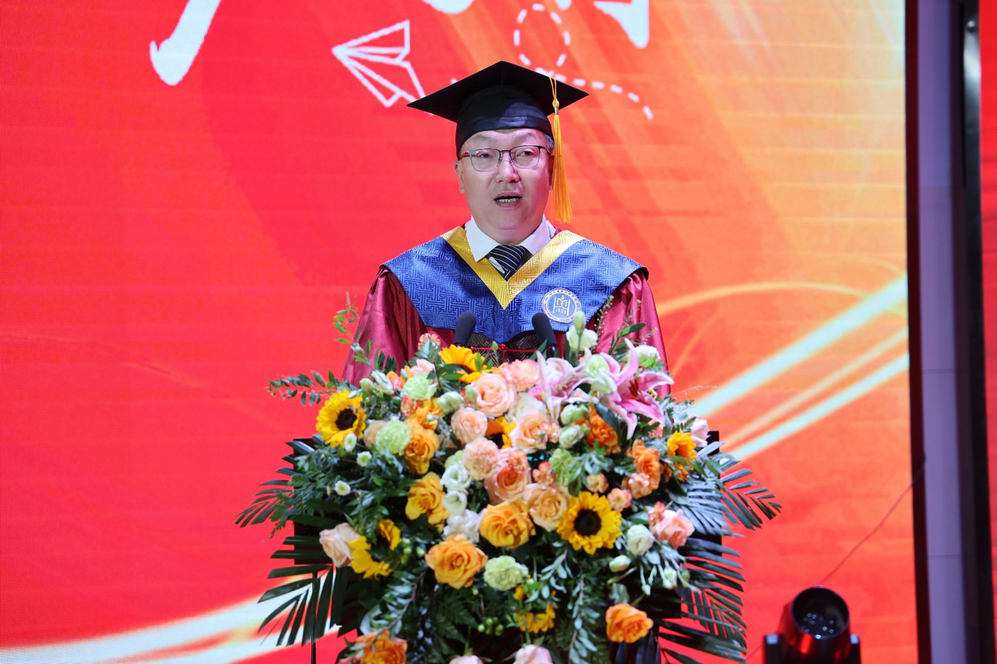 王敏校长在题为《奋楫启航向星辰大海 逐梦笃行谱青春华章》的毕业致辞中,回顾了即将毕业的民院学子们在校期间经历的建校70周年庆典和所见证的学校获批硕士学位授予单位的历程,并肯定学生在学术科研、比赛竞赛、社会实践方面取得的优异成绩,点赞学子们投身基层建设家乡,参军入伍保家卫国的时代担当。她希望毕业生们,要胸怀大局,做爱国奉献者,传承学校民族团结基因。要脚踏实地,从平凡事做起,践行 “靠得住、下得去、干得好”的品格。要勤学不辍,以终身学习适应时代,提升跨界能力。