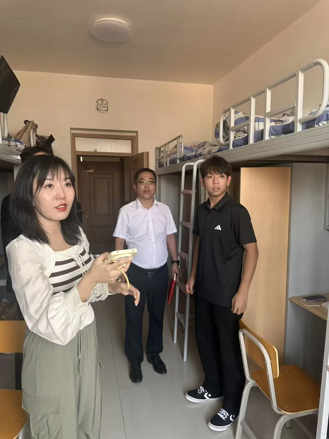 新生见面会结束后,学院领导与各班班主任共同前往新生宿舍走访。他们现场检查住宿设施,倾听学生的实际诉求,还亲切提醒新生需在宿舍生活中互帮互助、树立集体观念,助力大家更快融入大学新环境,让学院的关爱直达新生心中。