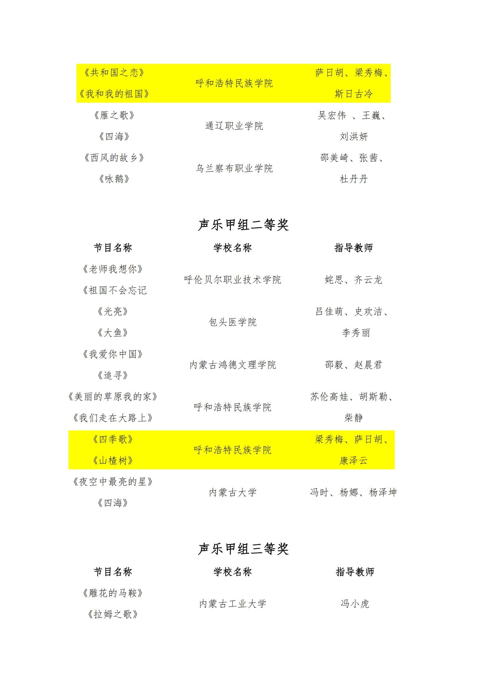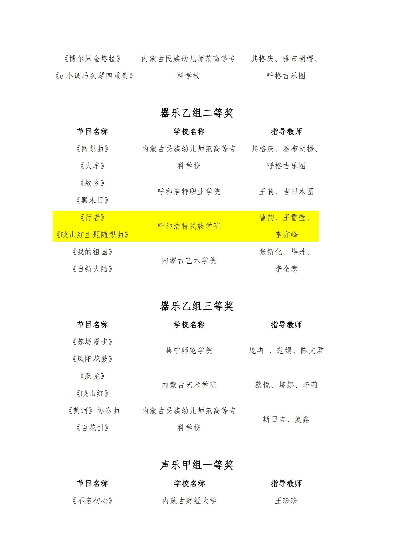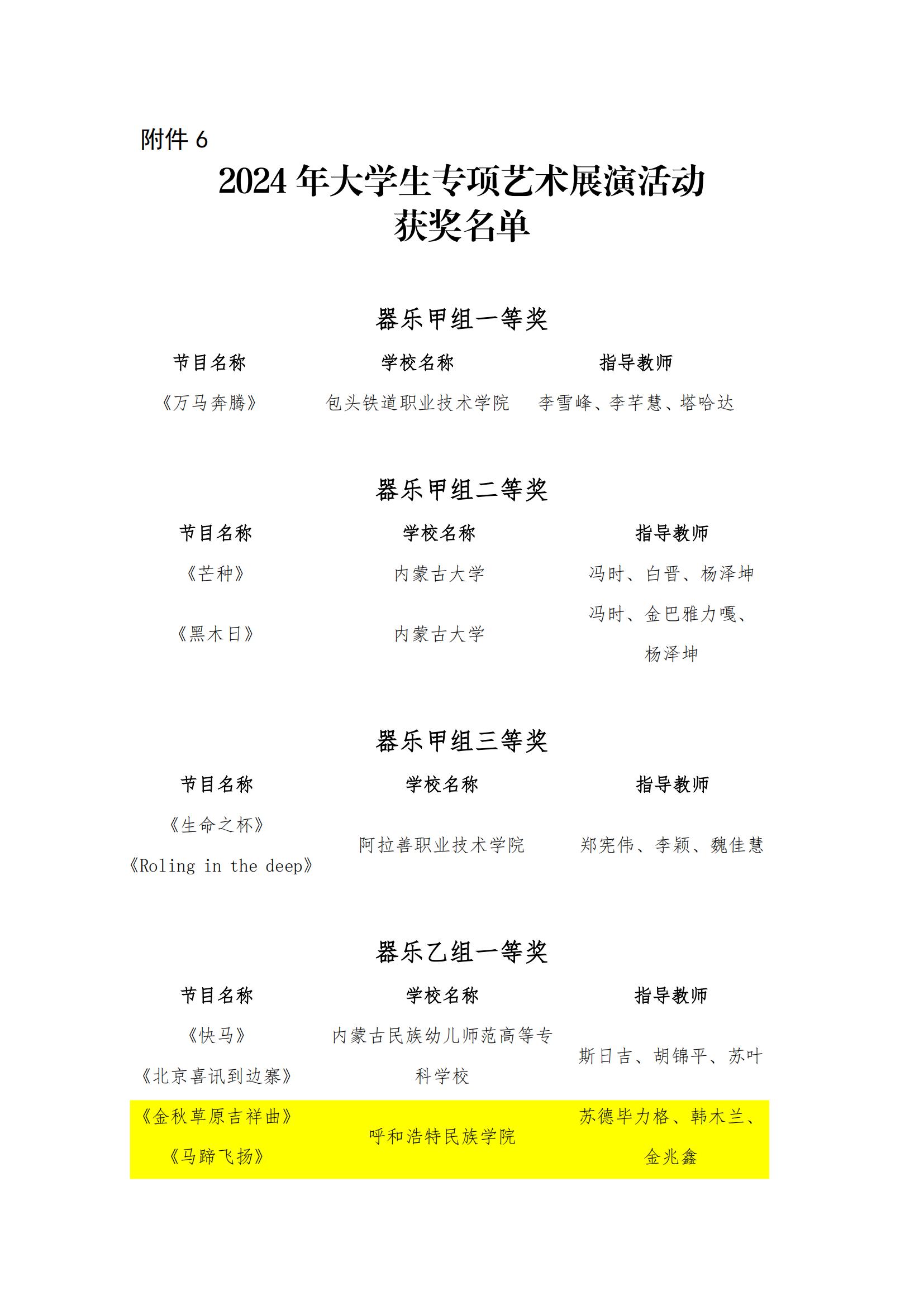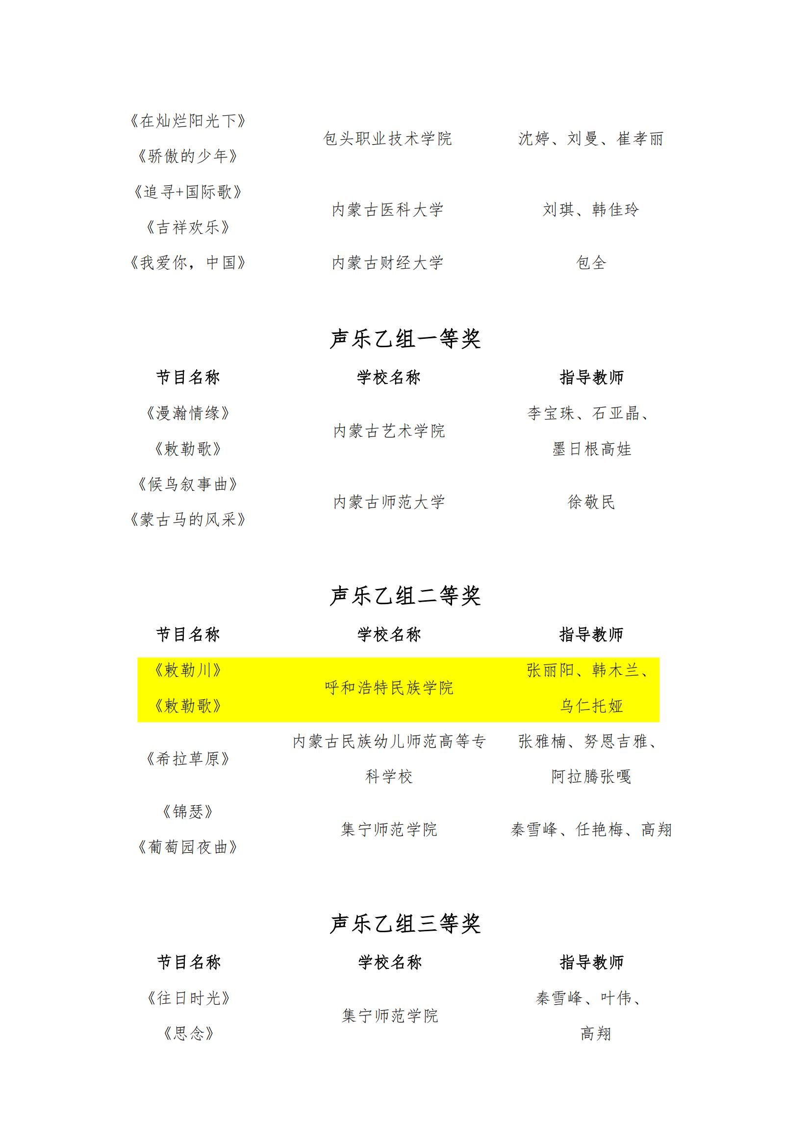 我院教师苏德毕力格、韩木兰、金兆鑫指导的《金秋草原吉祥曲》《马蹄飞扬》作品荣获大学生专项艺术展演活动器乐乙组一等奖;曹韵、王雪莹、李亦峰指导的《行者》《映山红主题随想曲》荣获器乐乙组二等奖;梁秀梅参与指导的《共和国之恋》《我和我的祖国》荣获声乐甲组一等奖,《四季歌》《山楂树》荣获声乐甲组二等奖;张丽阳、韩木兰、乌仁托娅指导的《敕勒川》《敕勒歌》荣获声乐乙组二等奖。取得了Beat365在全区艺术类展演活动上的新突破。